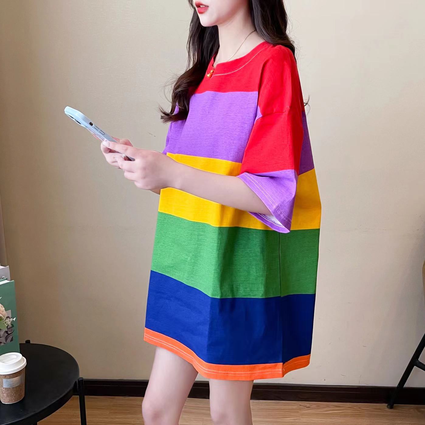 中长款 彩虹条纹撞色短袖 宽松韩版 网红爆款 上衣 T恤女潮2025新款