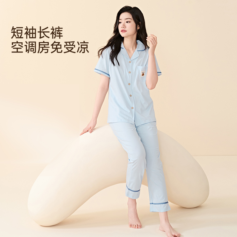 纯棉短袖 长裤 家居服夏天薄款 加大码 睡衣女士夏季 夏款 套装 莱卡棉