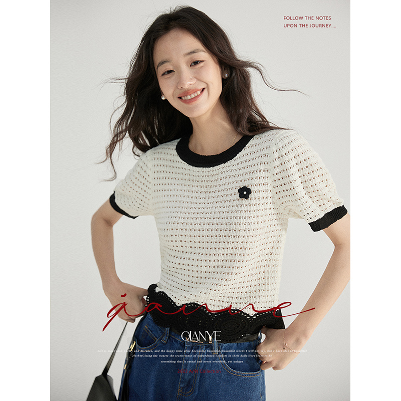 上衣2025花边气质撞色短袖 镂空针织套头泡泡袖 T恤女 新款 浅耶夏季