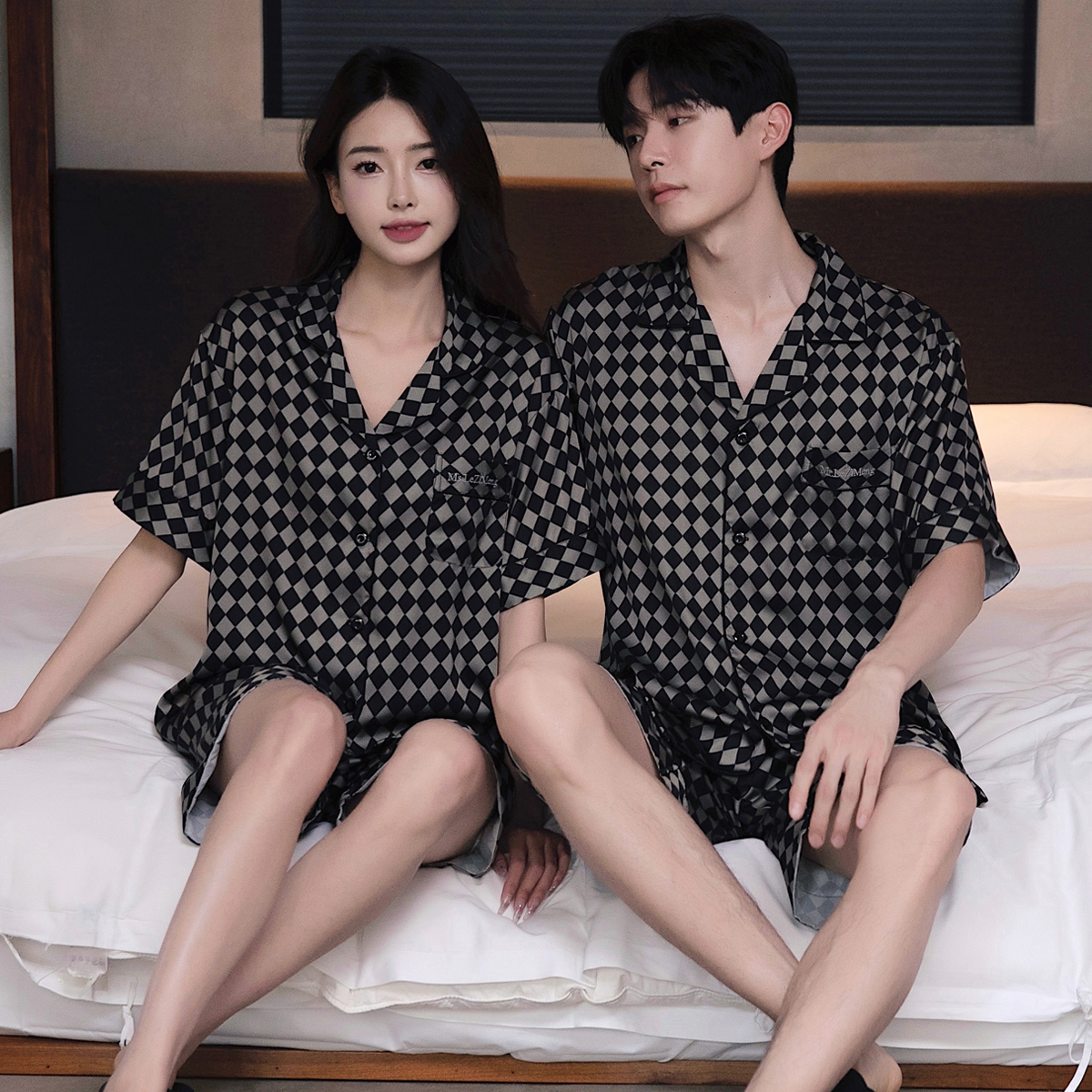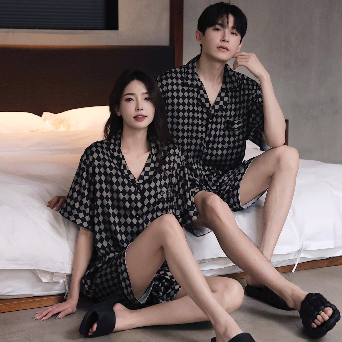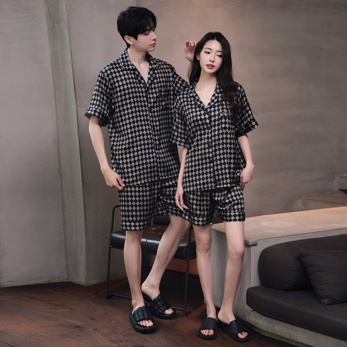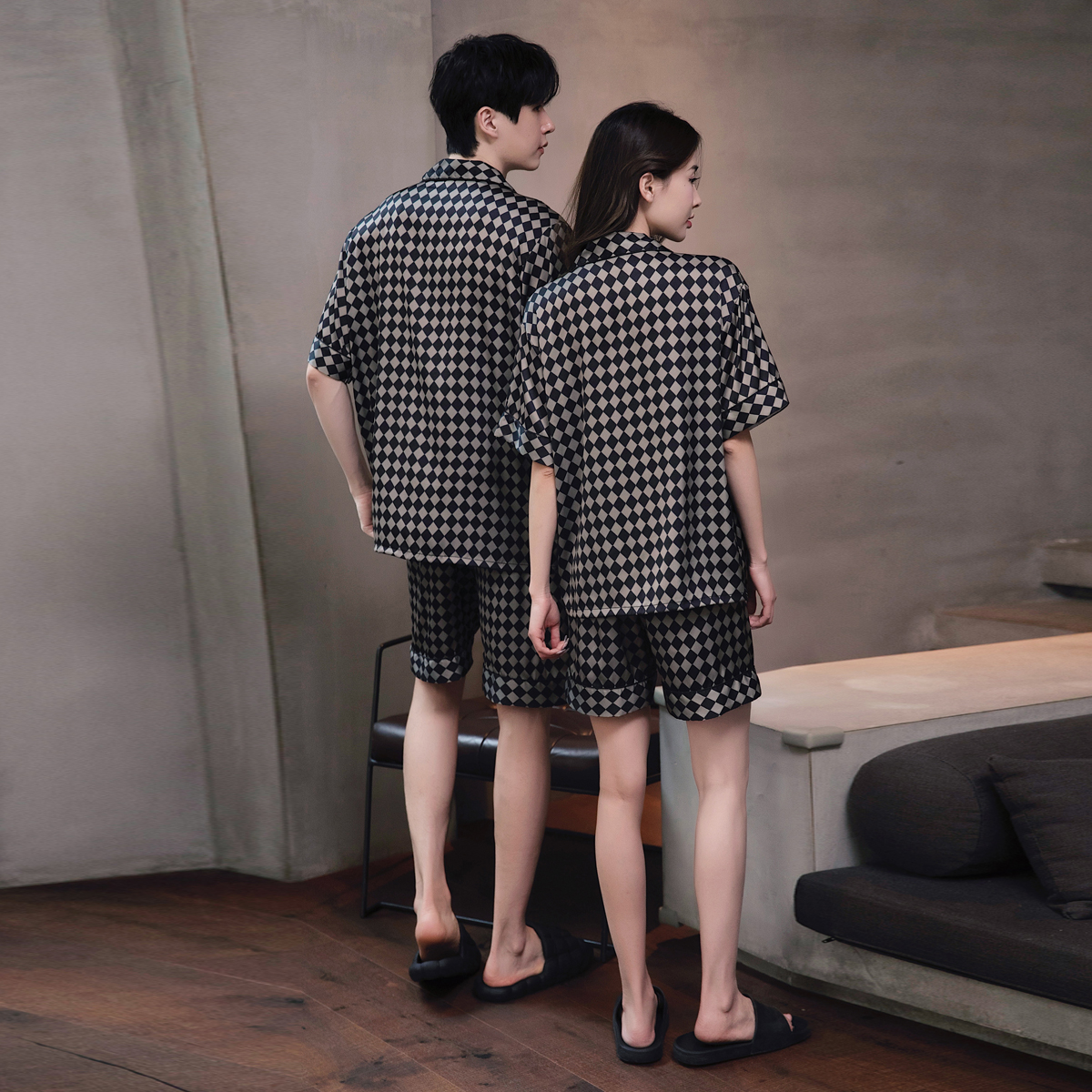 高档丝绸家居服男夏天可外穿黑色套装 短裤 短袖 冰丝情侣睡衣女夏季