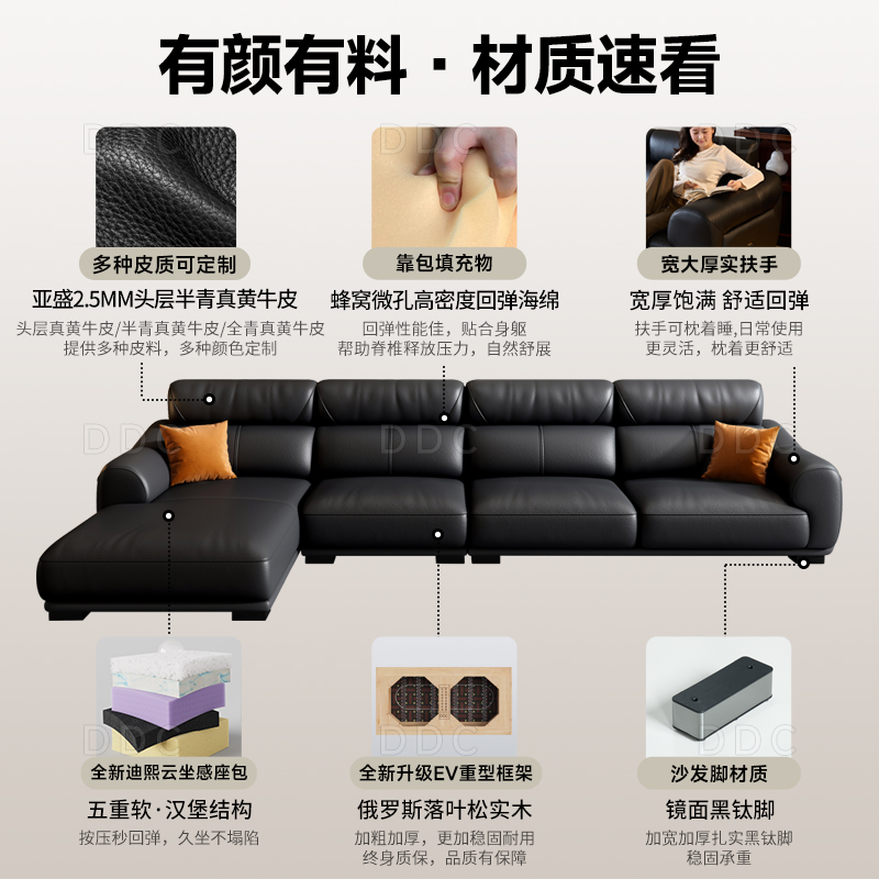 政府补贴DDC意式 黑色真皮沙发客厅简约贵妃位头层牛皮沙发极简