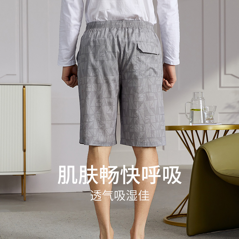 青年夏天纯棉薄款 秋鹿仿真丝睡裤 几何简约家居贡缎五分裤 夏季 男款