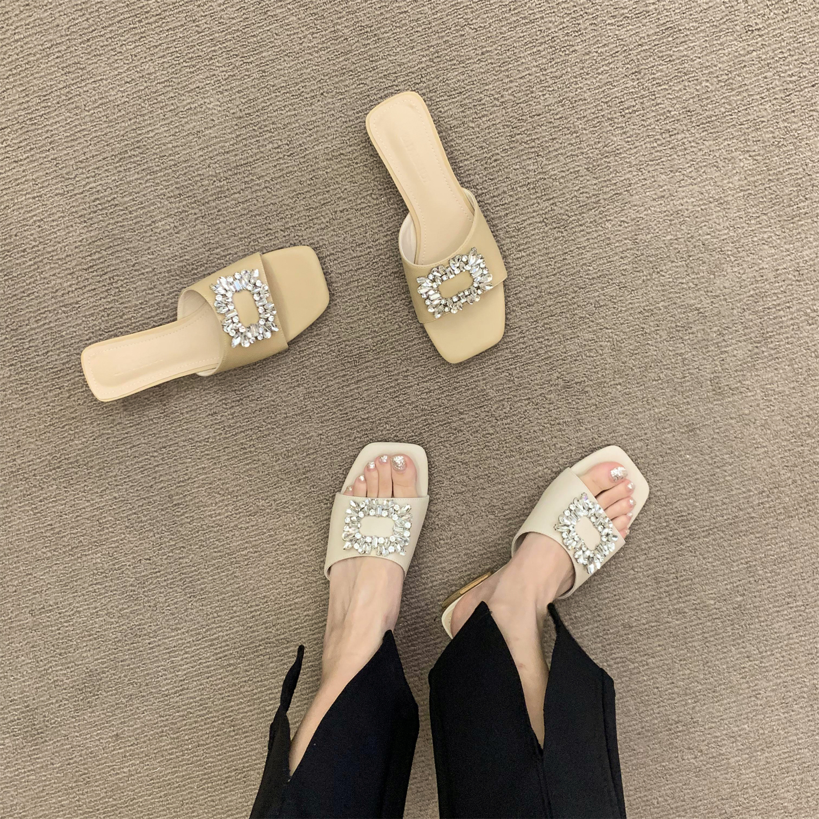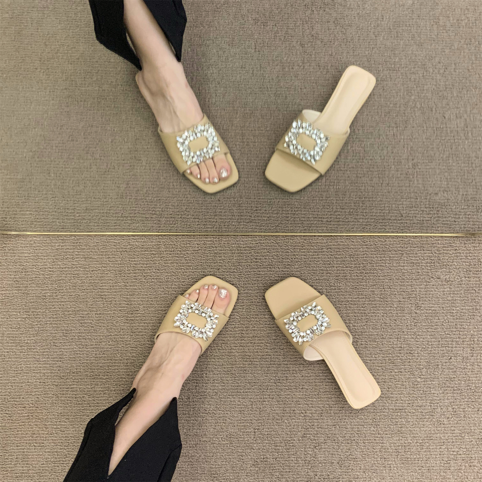 仙女风凉拖鞋 韩版 外穿2025新款 女夏季 方头露趾一字拖 水钻平底拖鞋