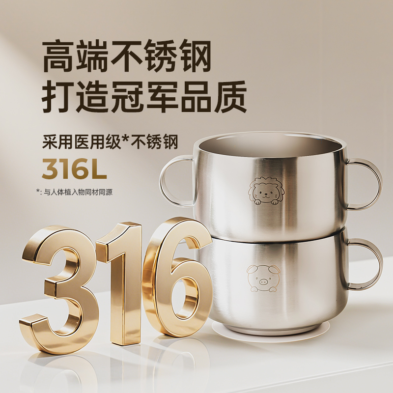 onlycook 316L不锈钢儿童碗食品级宝宝吸盘辅食碗婴幼儿吃饭餐具