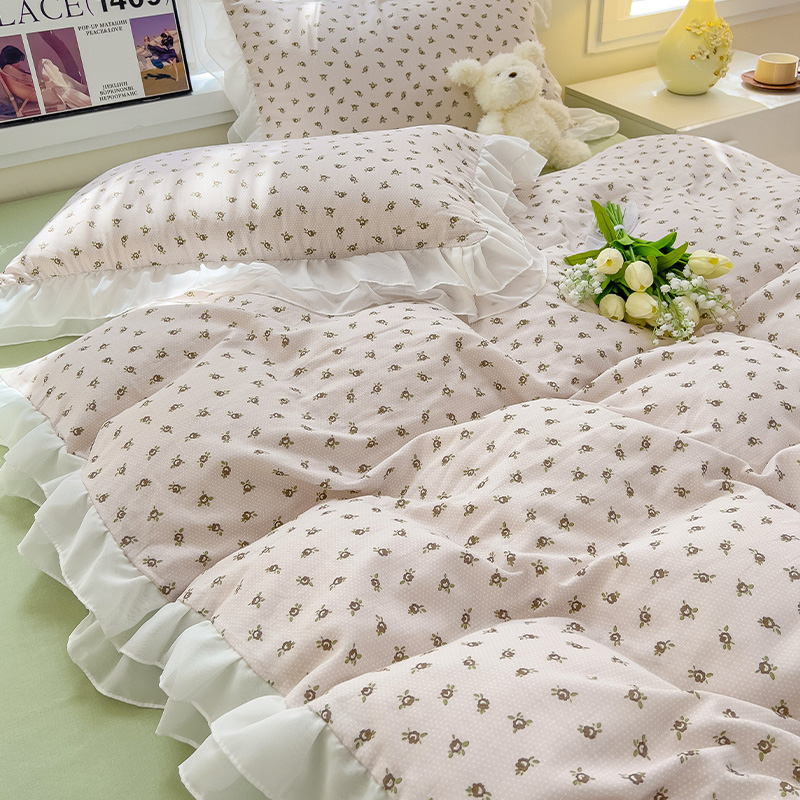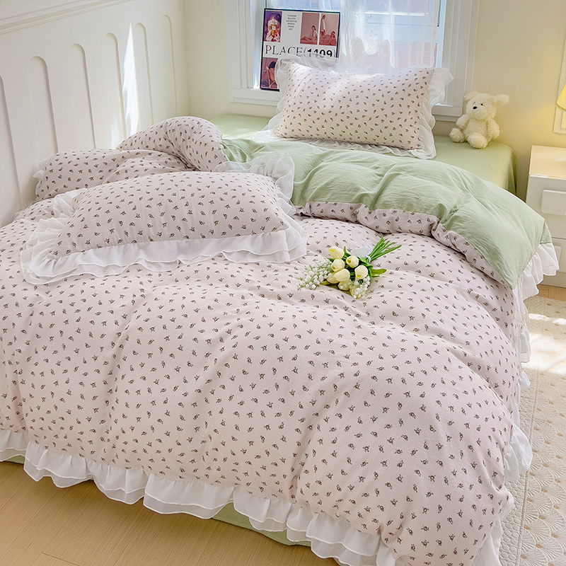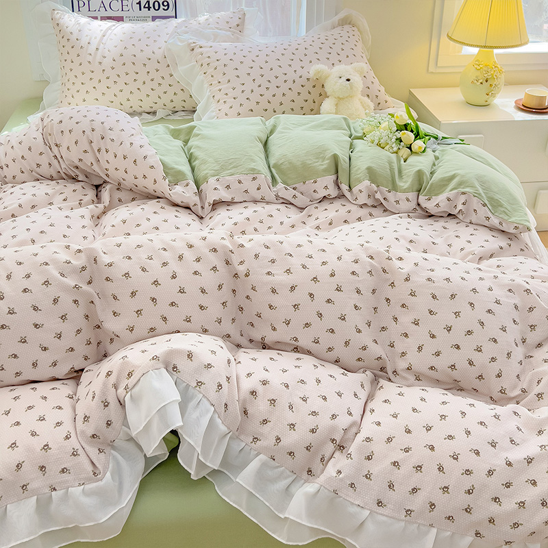 公主风全棉双层纱花边四件套韩式 荷叶边小碎花床上用品