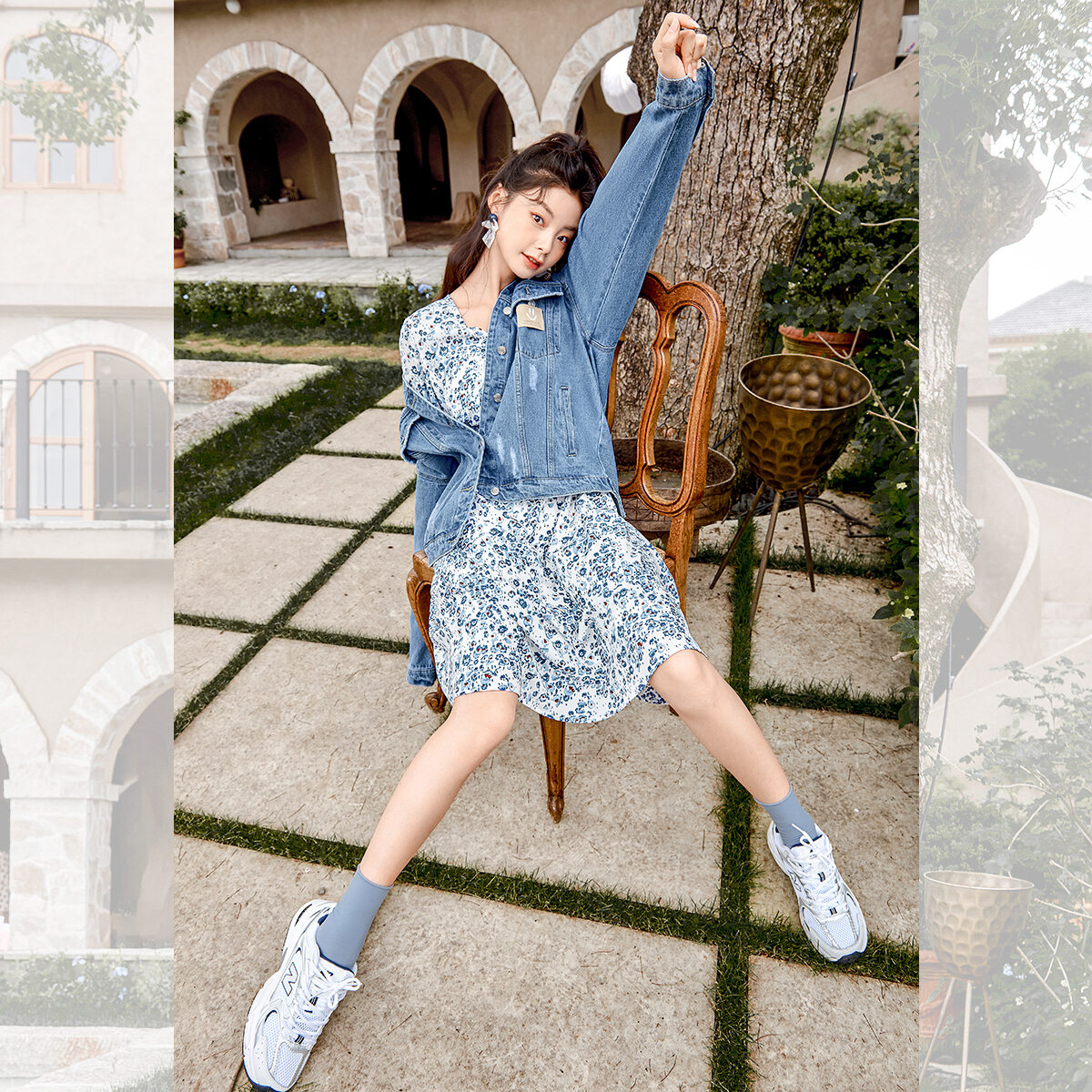 清澈之心 百搭圆领开衫 秋季 法式 外套蓝色吊带连衣裙女 新款 乔拉