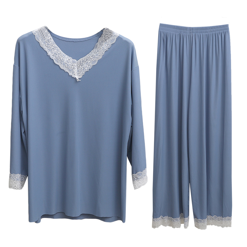 阔腿裤 2024春秋新款 薄螺纹内搭家居休闲长裤 T恤女睡衣套装 V领长袖