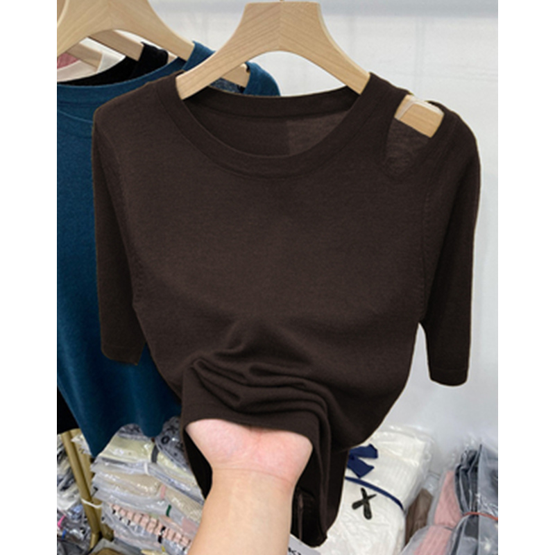 别致小衫 上衣洋气夏季 针织薄款 欧货设计感镂空露肩T恤女冰丝短袖
