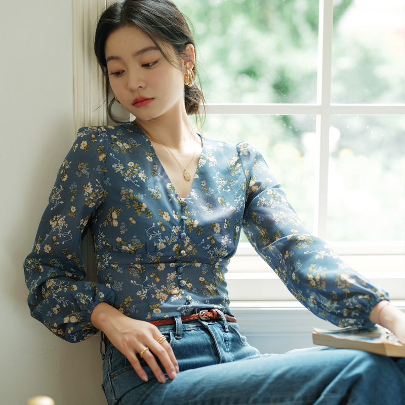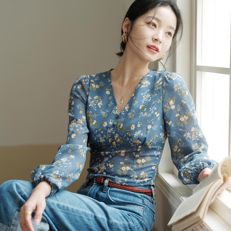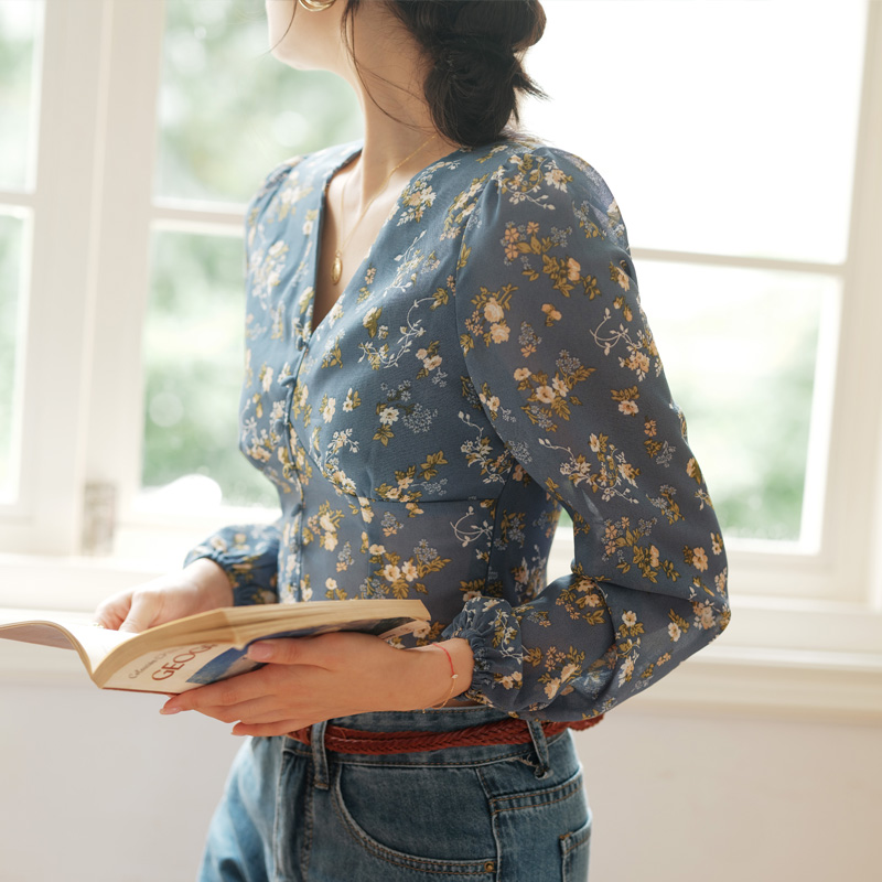 春季 诺比昂2025新款 衬衫 复古蓝色碎花V领气质长袖 别致上衣女 法式