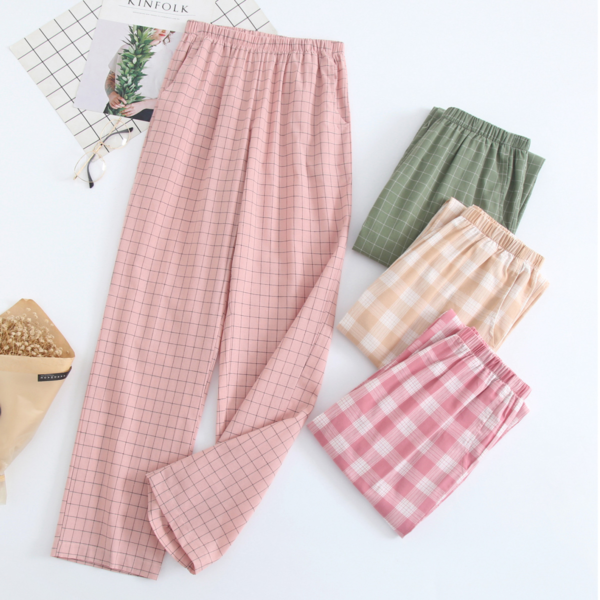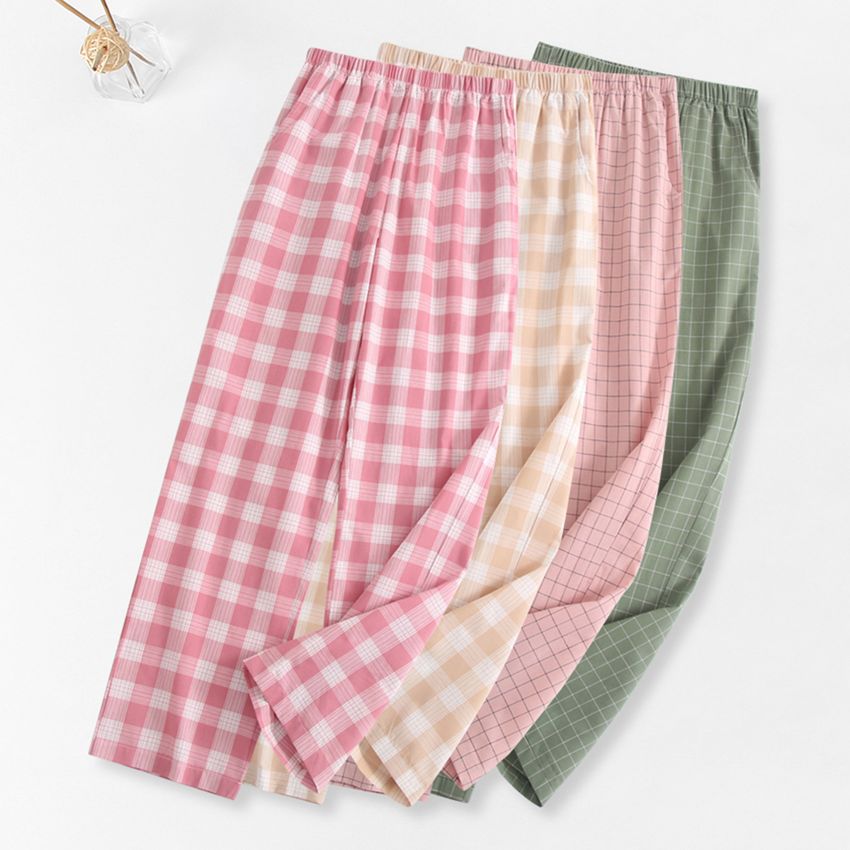 睡裤 AB内衣女士夏季 青年格子印花家居裤 透气纯棉梭织长裤 U852 薄款