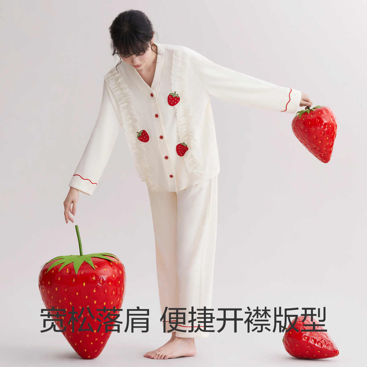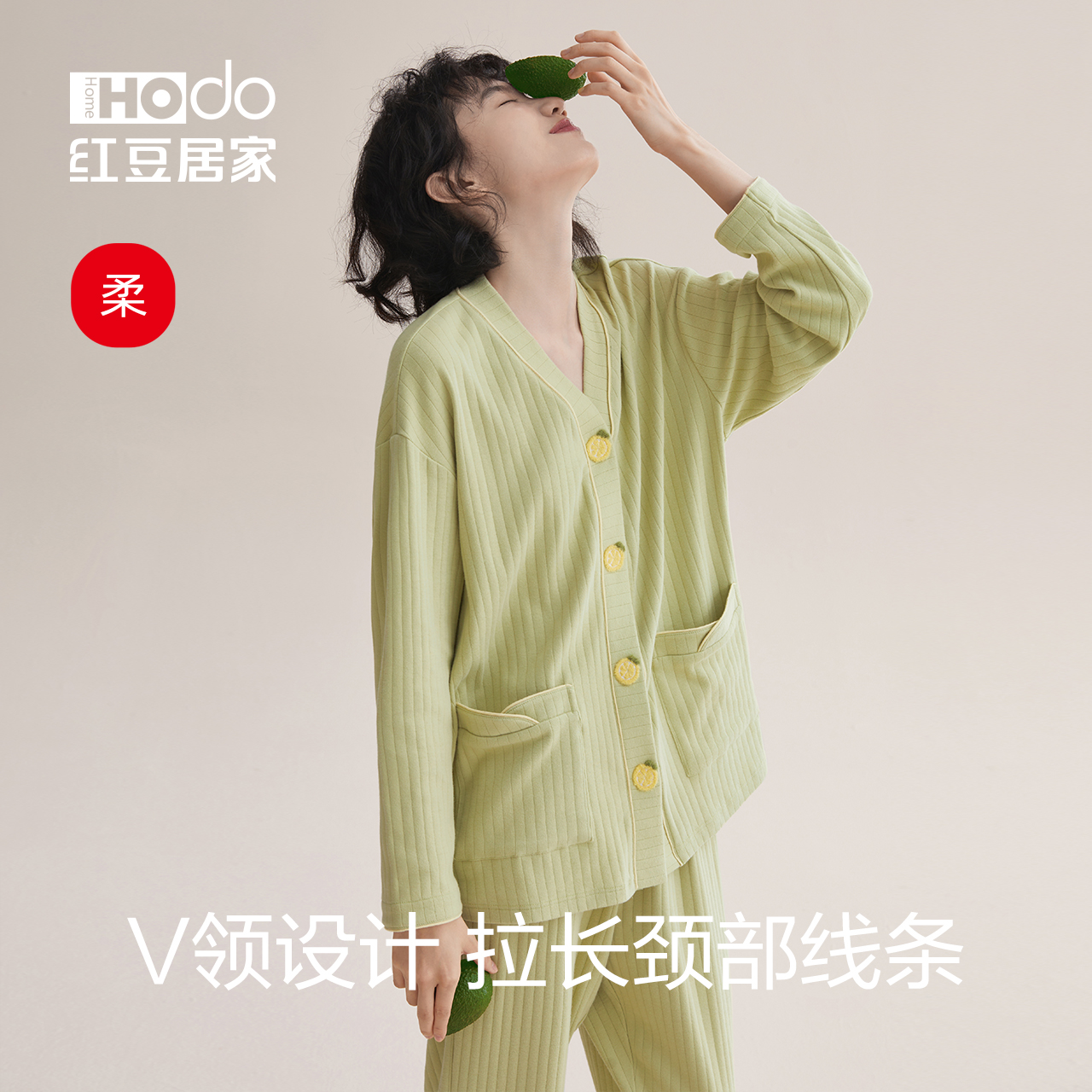 红豆居家睡衣女春秋款 柔软全棉奶乎乎V领家居服可外穿 纯棉长袖