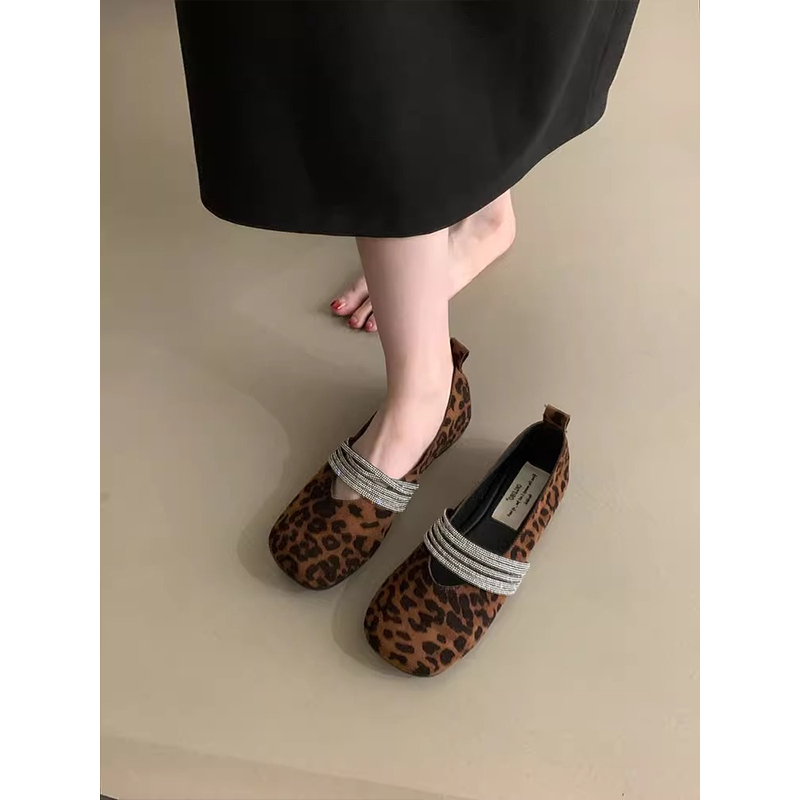女2025新款 平底浅口女鞋 秋季 复古方头单鞋 法式 达芙妮豹纹玛丽珍鞋