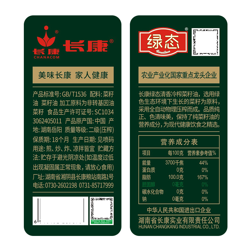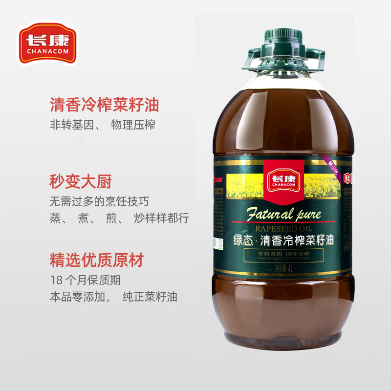 长康清香冷榨菜籽油4升L压榨食用油家用植物油批发非转基因绿态