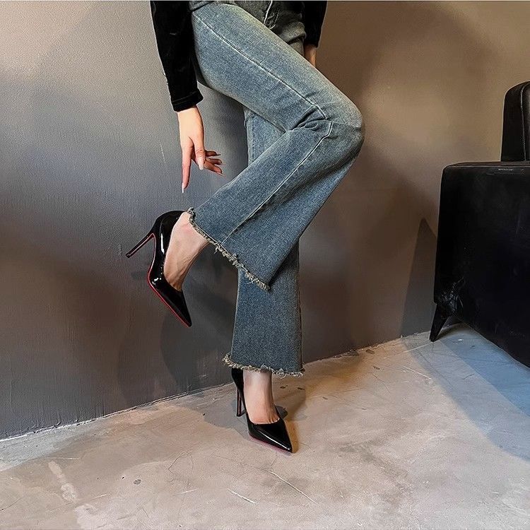 女 侧空红底裸色浅口气质单鞋 2025新款 细跟尖头漆皮名媛高跟鞋