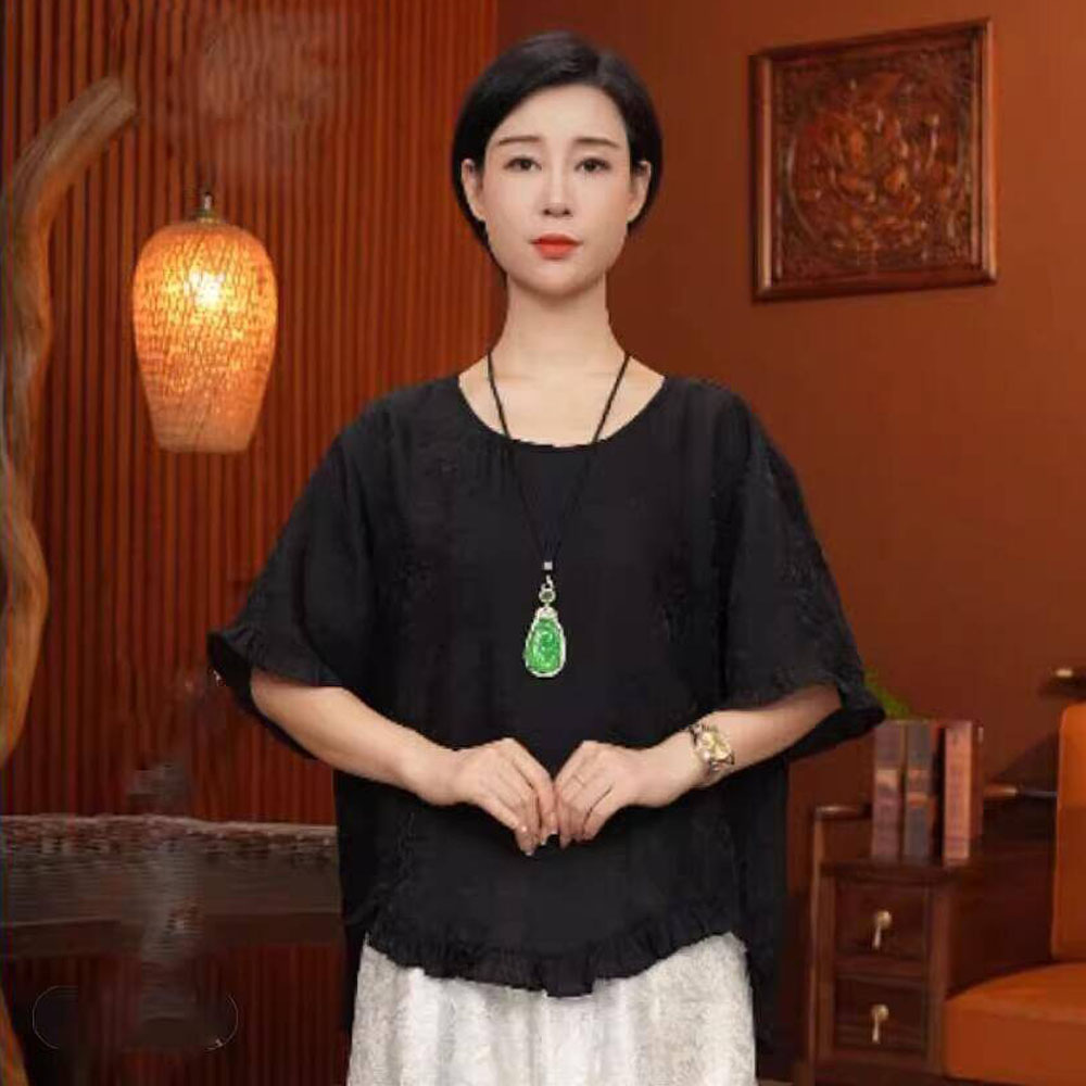 宽松洋气短袖 2025夏季 时尚 国风薄款 木耳边不规则下摆圆领上衣 新款