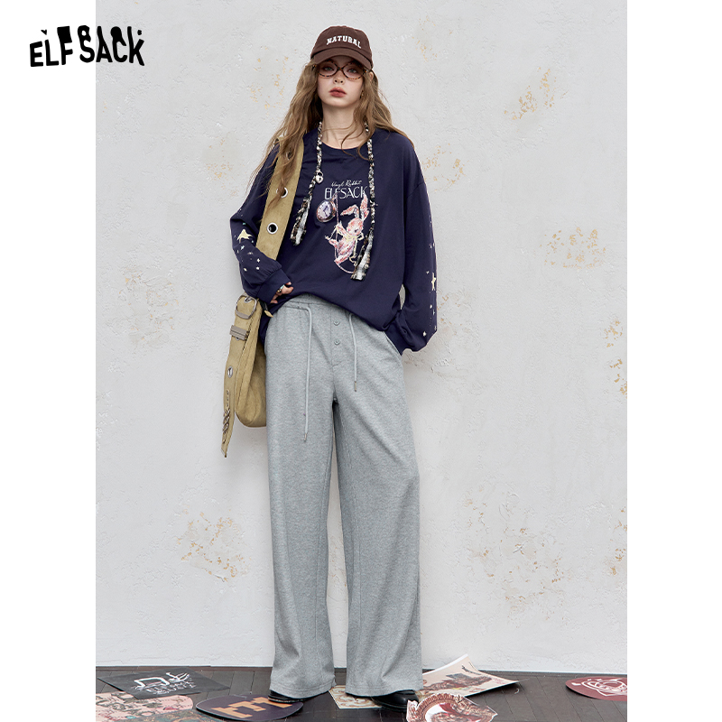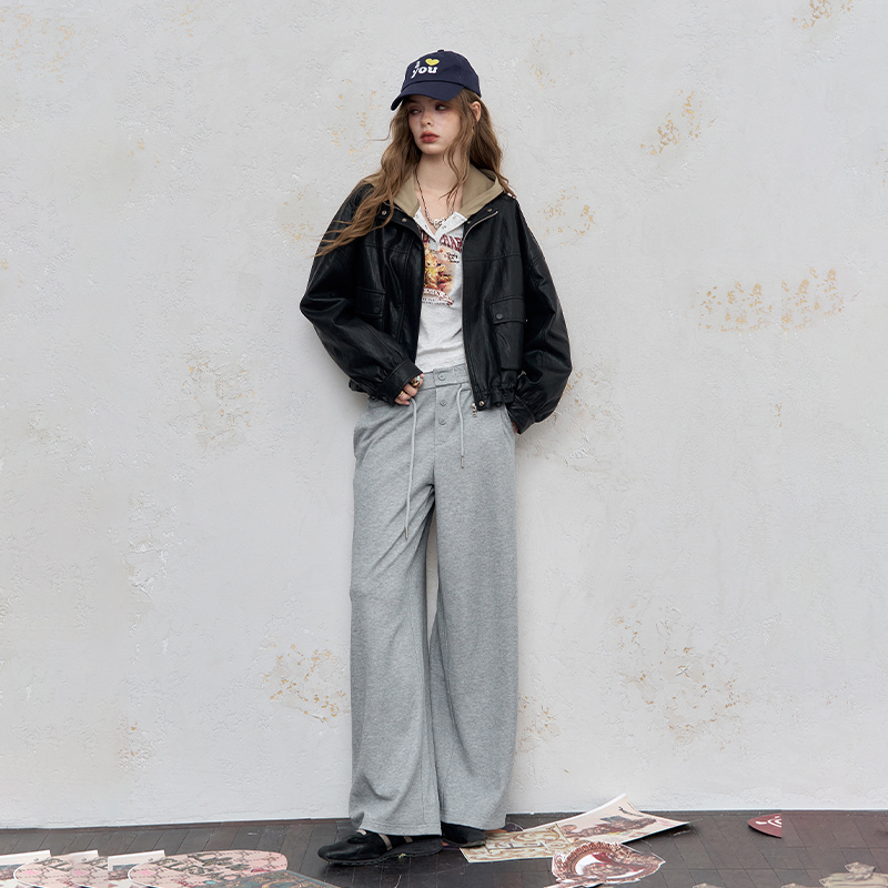 宽松高腰显瘦卫裤 妖精 新款 子女2025秋季 口袋灰色撒银针织直筒裤