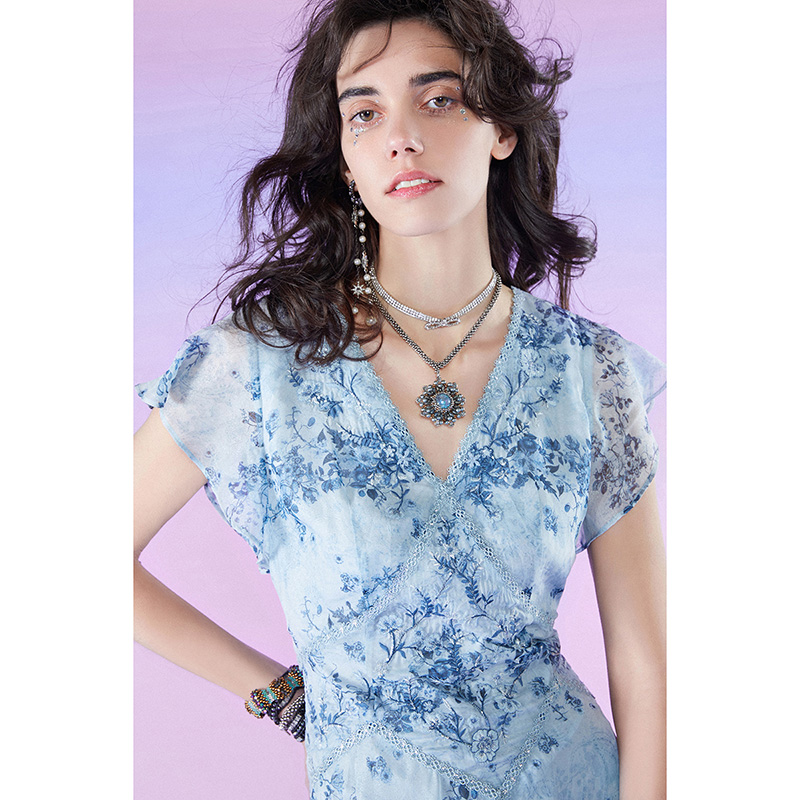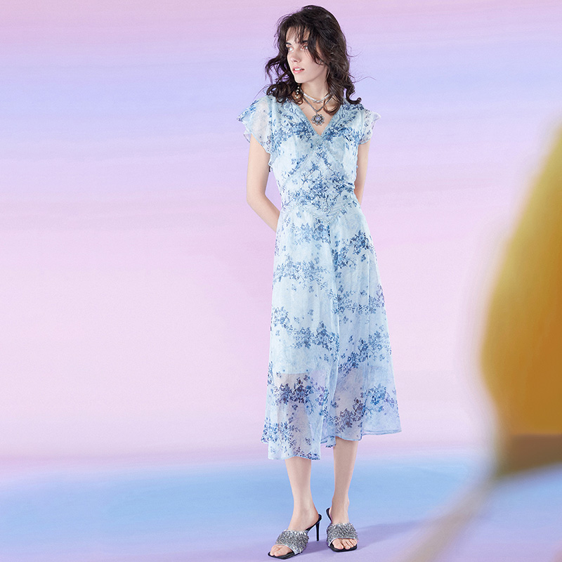连衣裙71EO224039 V领绣花落花边雪纺短袖 莲灿2025夏季 新商场同款