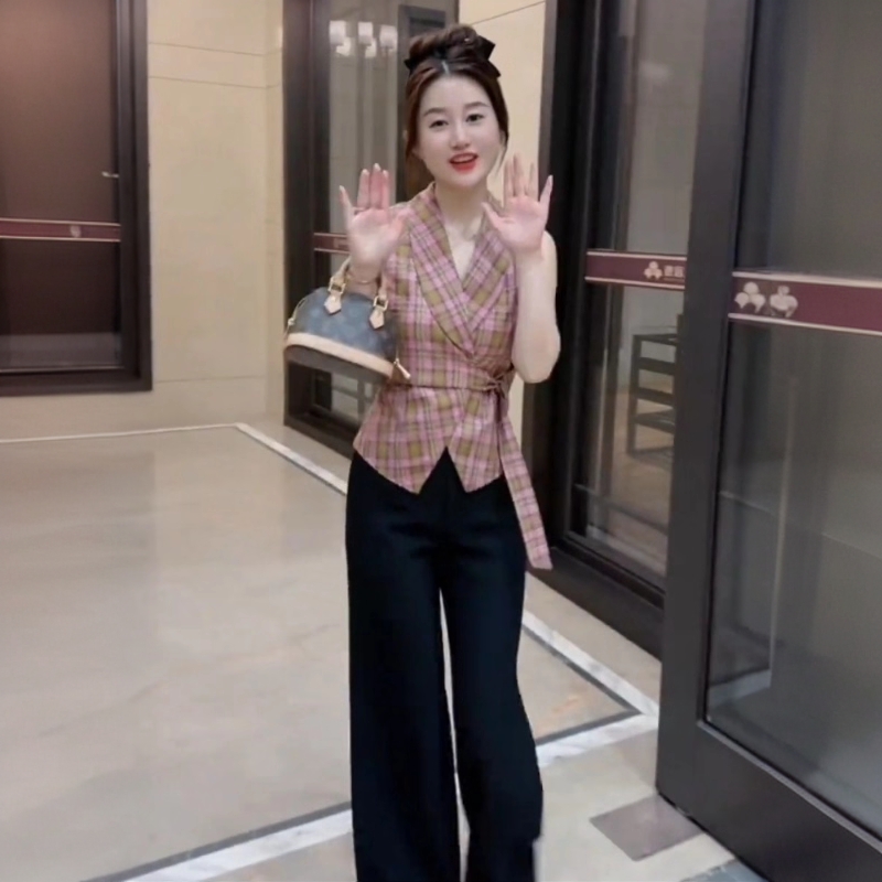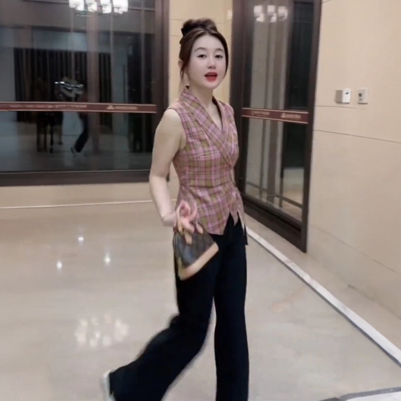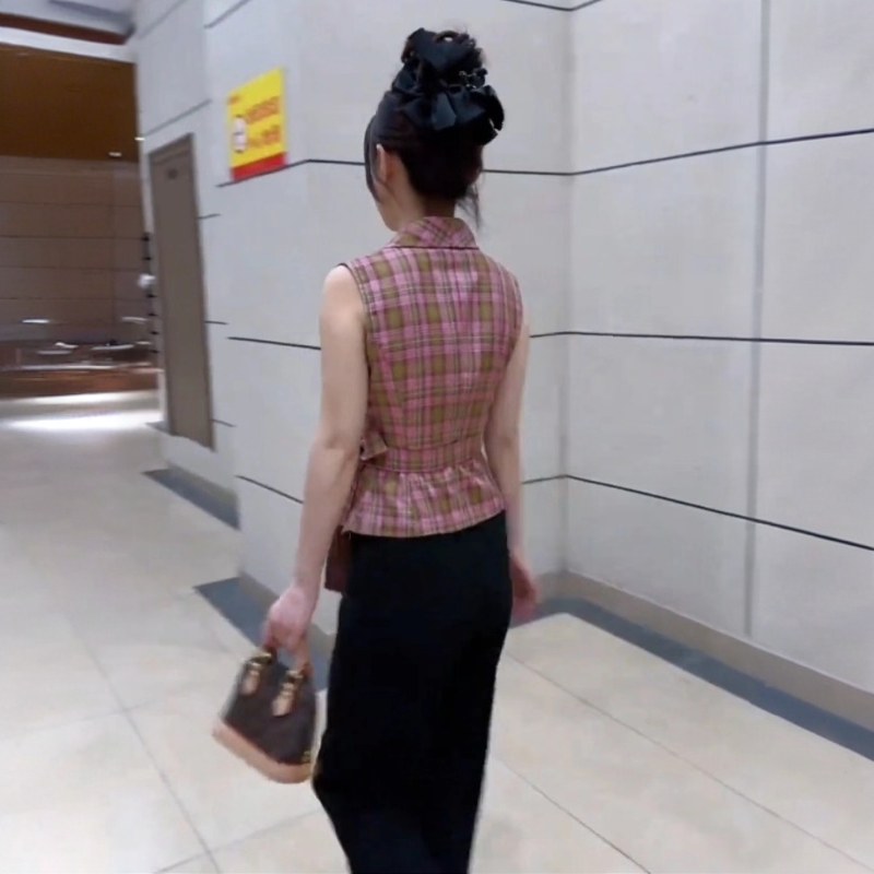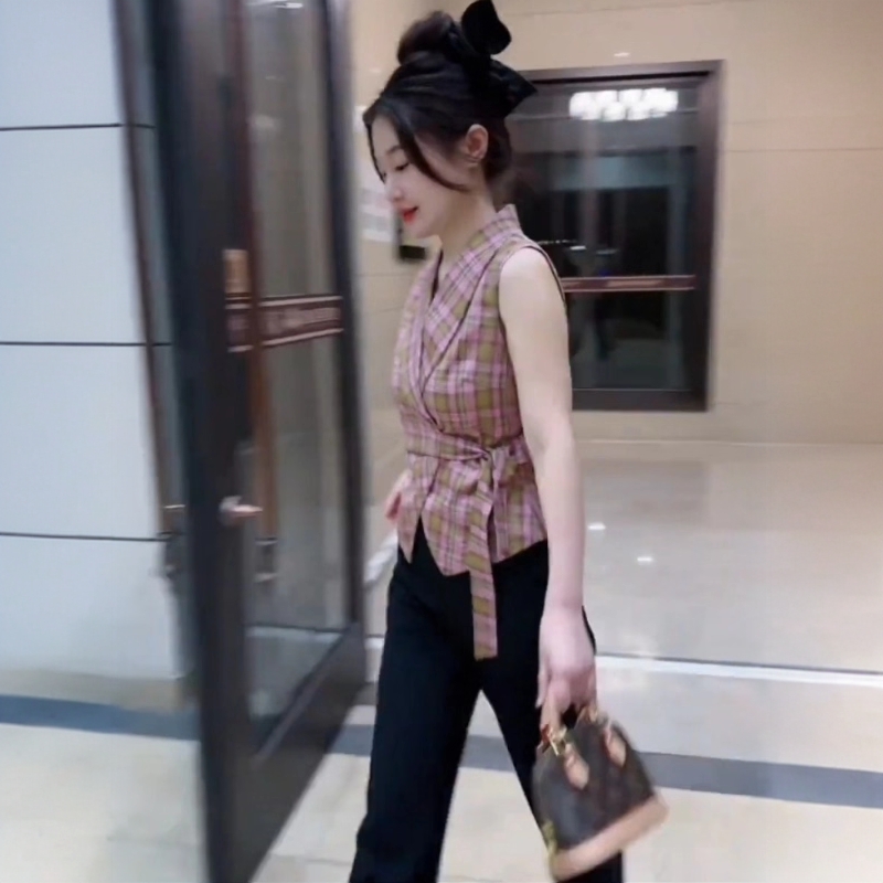 粉色格子小上衣女夏季 2025新款 绝美通勤无袖 法式 独特漂亮掐腰小衫