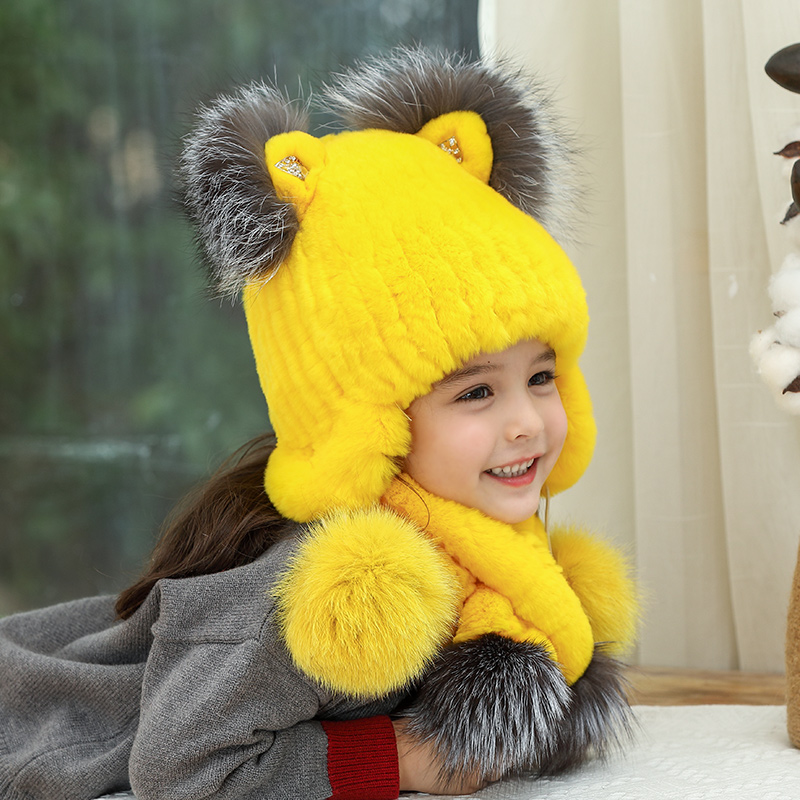 男童可爱毛球编织帽秋冬户外女孩加厚保暖獭兔毛冬天护耳皮草帽子