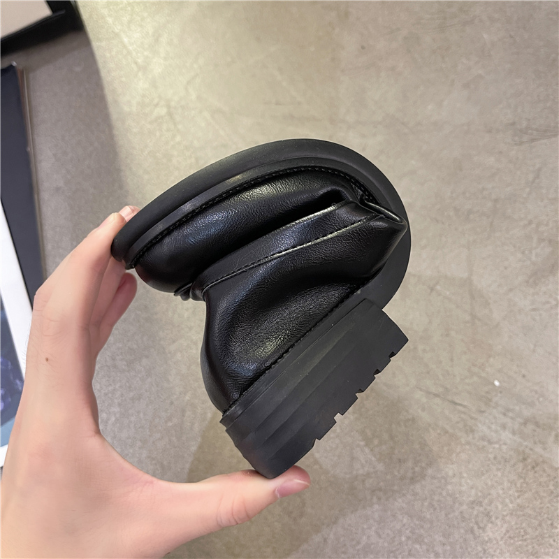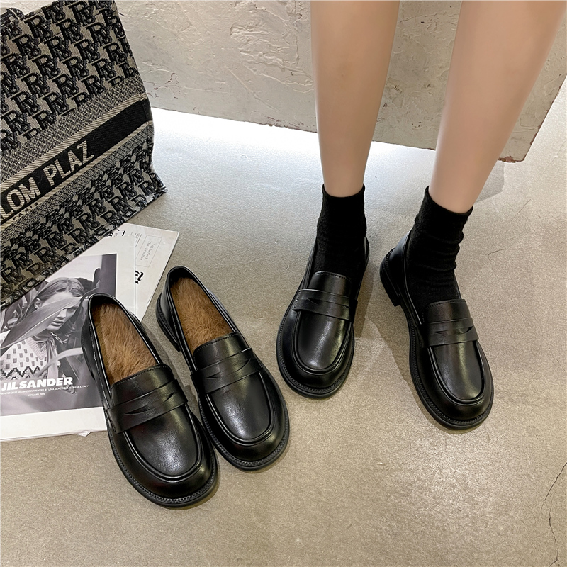 职业上班小黑鞋 春秋软皮百搭单鞋 冬 女英伦风黑色平底小皮鞋 乐福鞋
