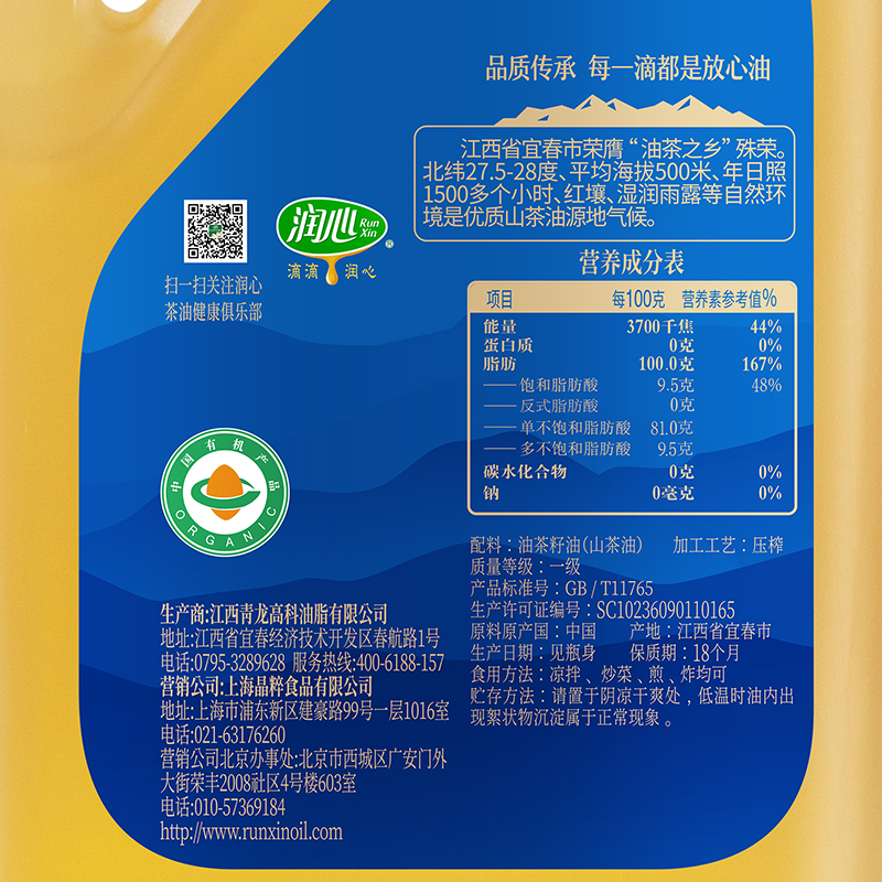 润心0反式 爆款 有机山茶油2L物理冷榨茶籽油清淡 官方正品