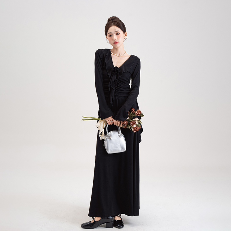 新款 上衣半身裙套装 法式 V领针织衫 立体花朵飘带褶皱修身 2025秋季