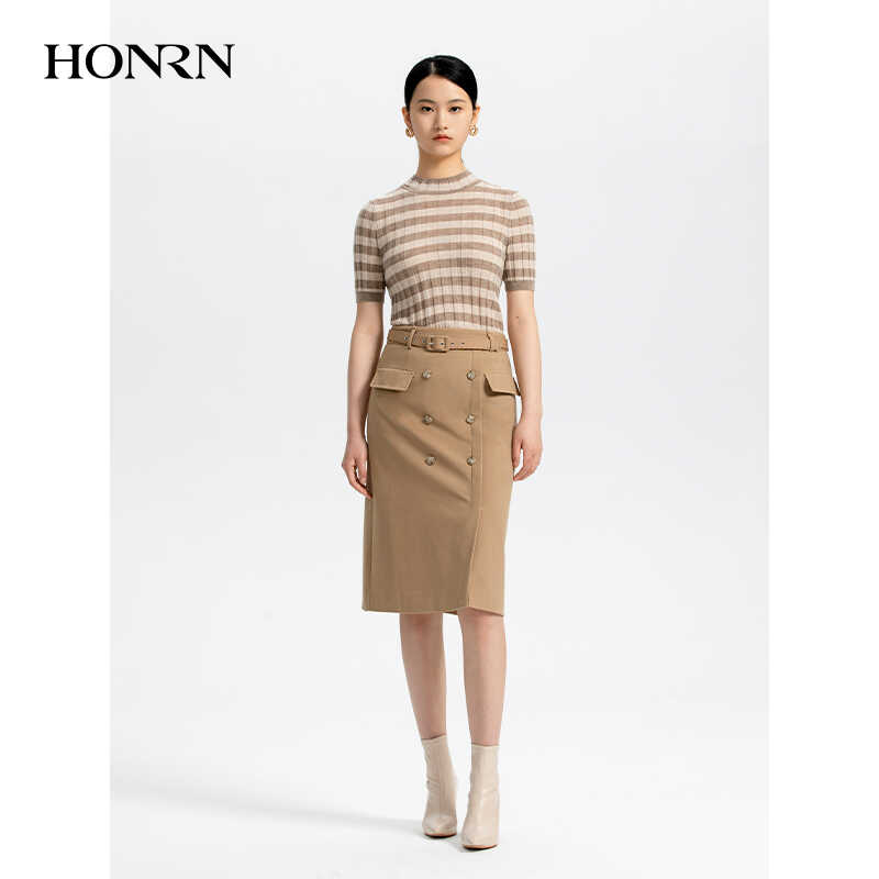 HONRN 红人气质双排扣直筒裙子遮肚子显瘦半身裙女春秋HH33OQ511