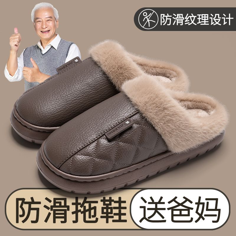 2025新款 冬季 室内家居防滑加绒厚底皮面pu防水棉拖老人 男士 棉拖鞋