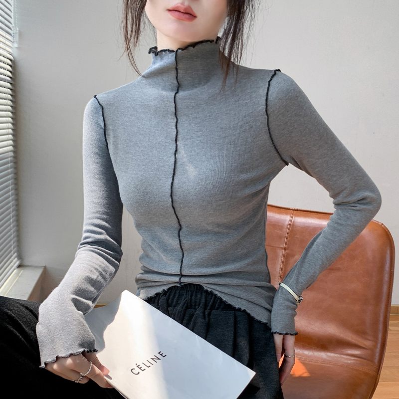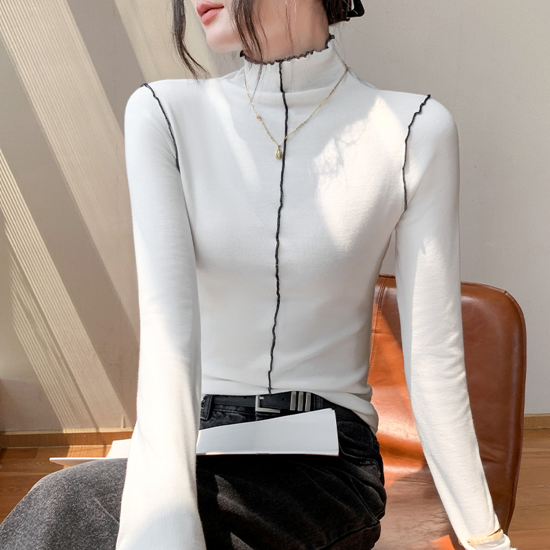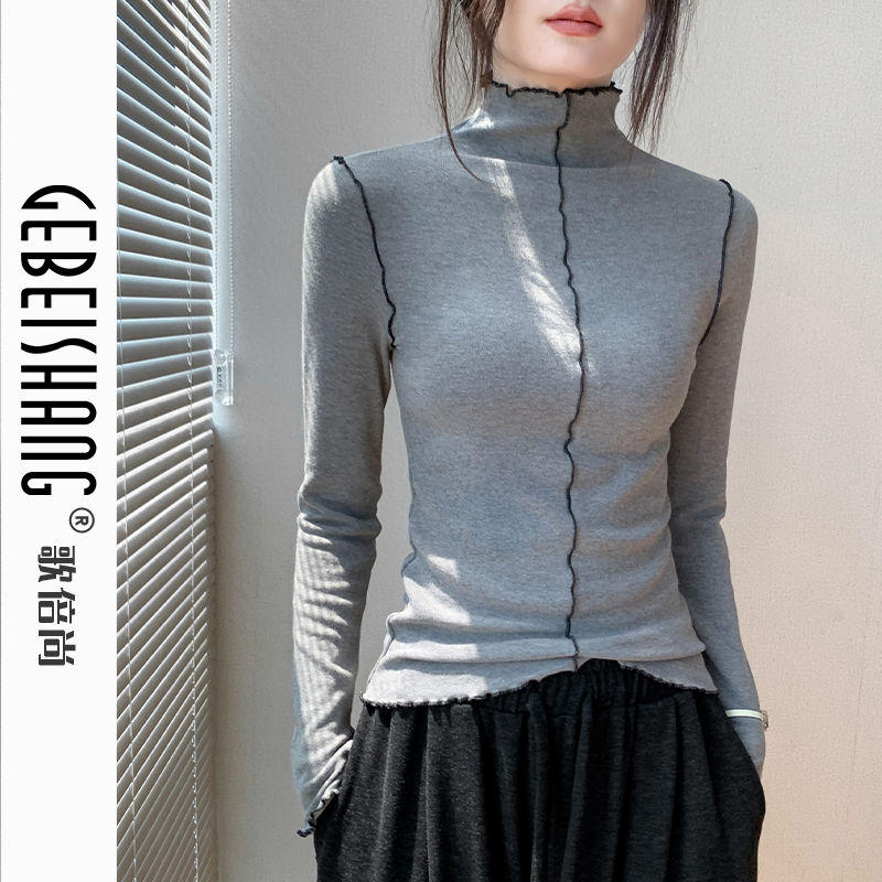 正肩打底衫 花边半高领长袖 拼接设计感修身 新款 磨毛T恤女2025秋季