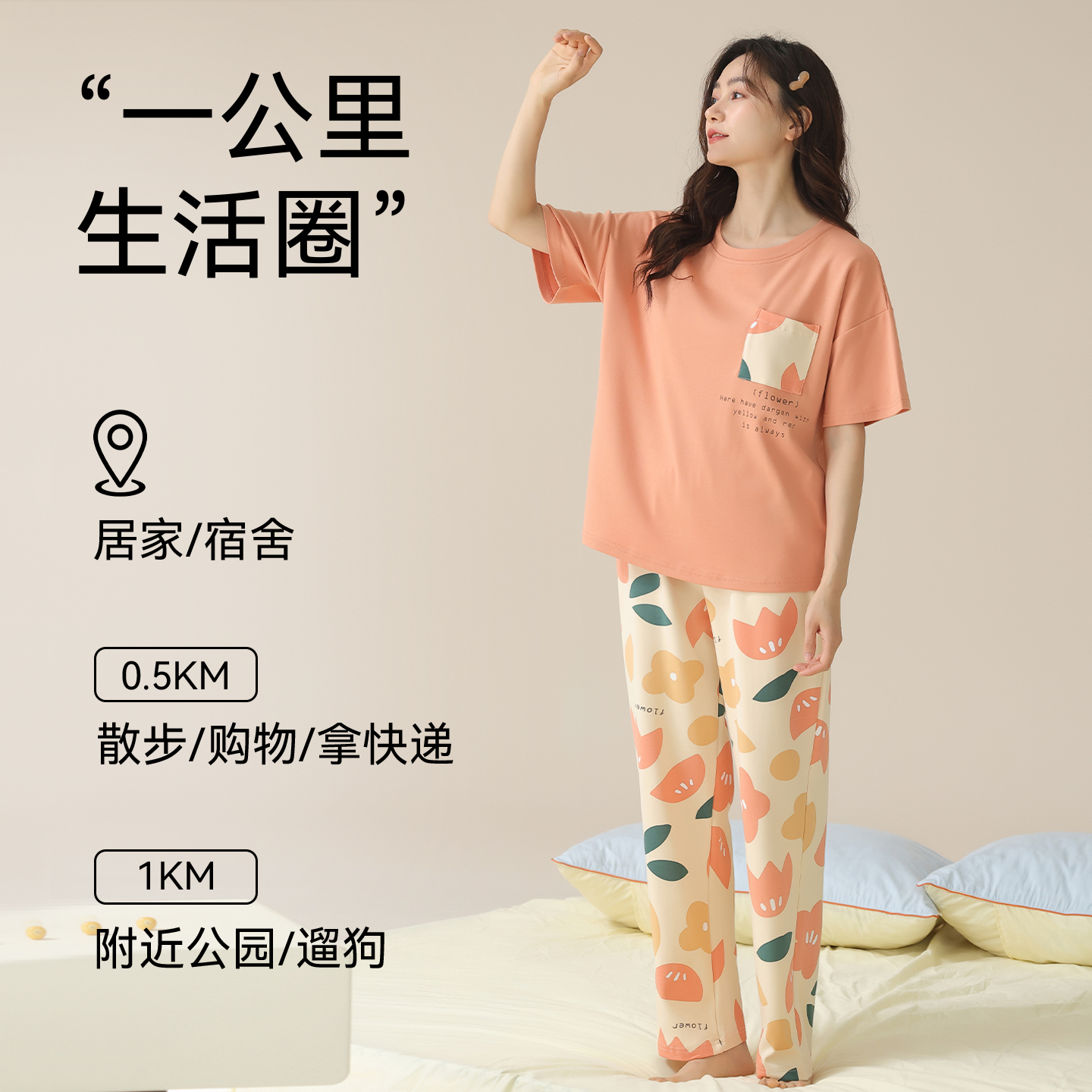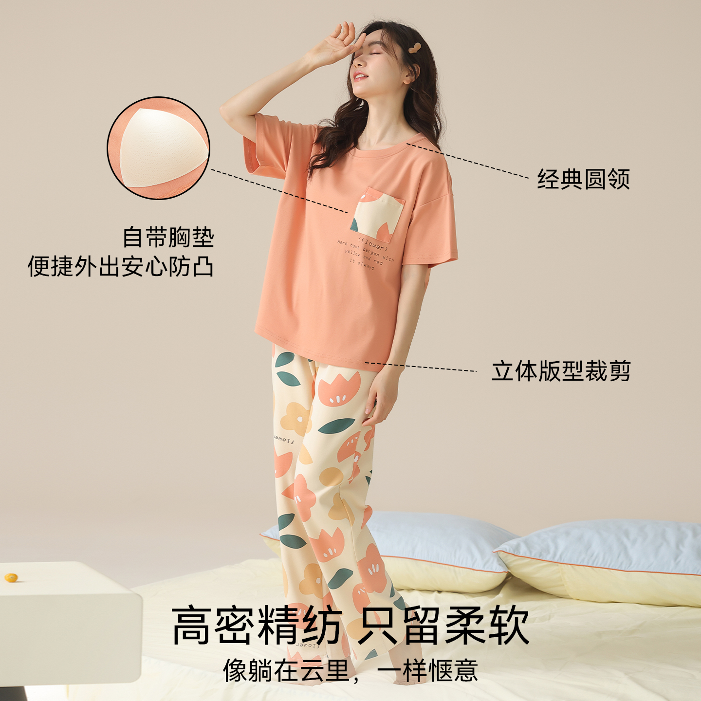 短袖 家居服两件套装 长裤 可外穿韩式 短裤 浪莎纯棉带胸垫睡衣女夏季