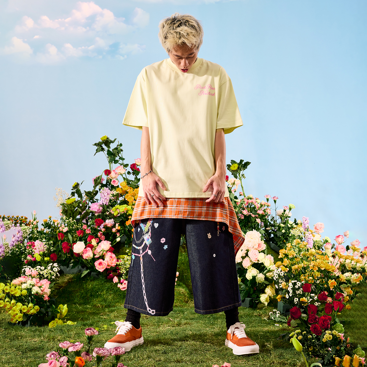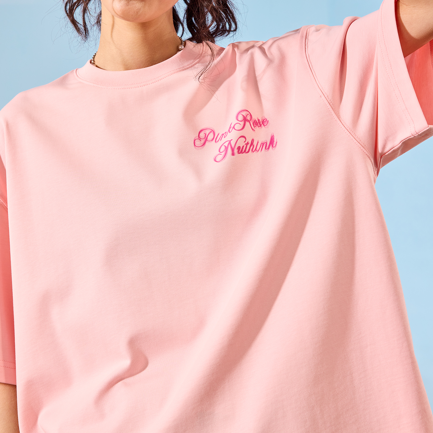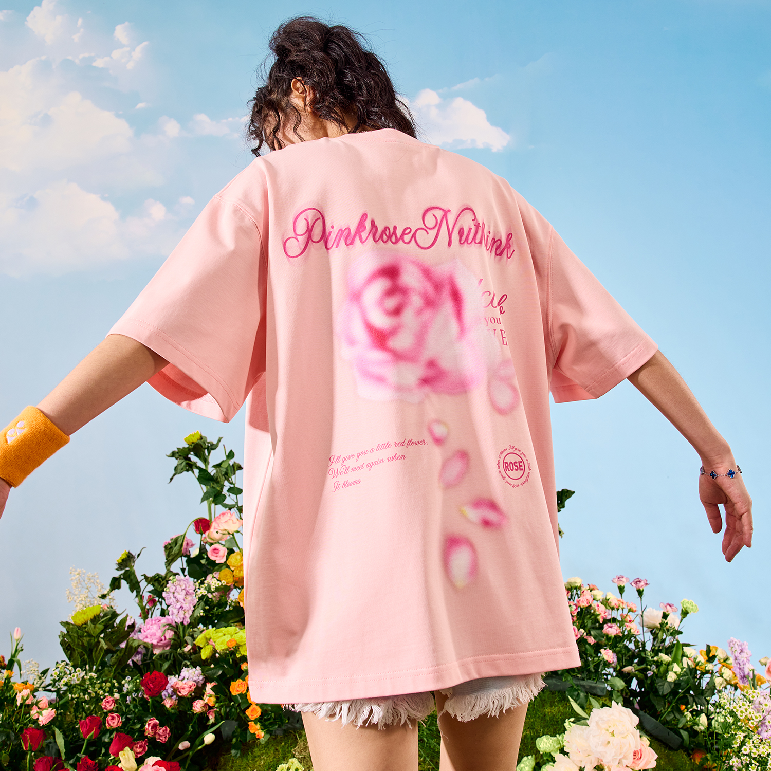 宽松T恤男女情侣2025夏新款 Nuthink美式 潮牌粉色模糊玫瑰印花短袖
