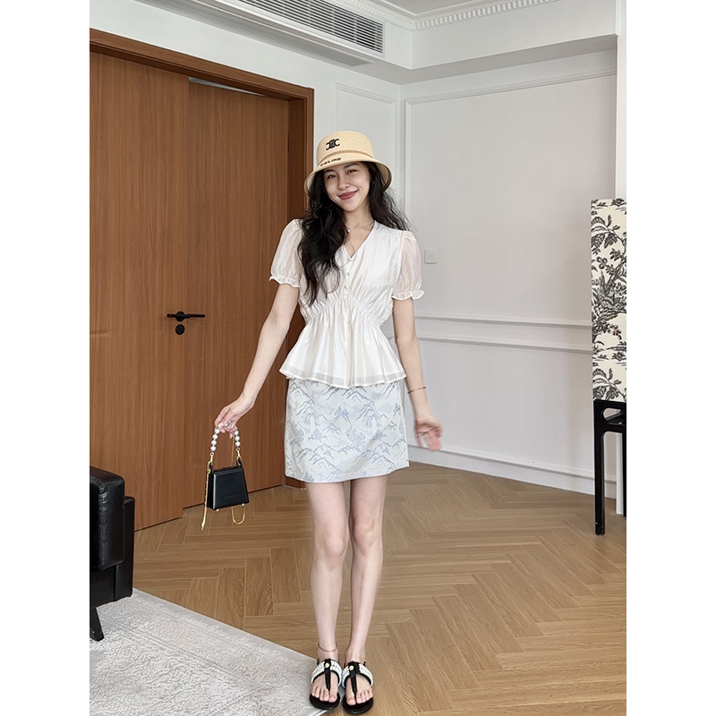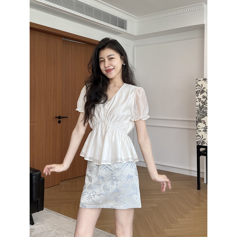 高腰提花半身裙两件套装 张阿星 莱赛尔质感衬衫 法式 白玉美人