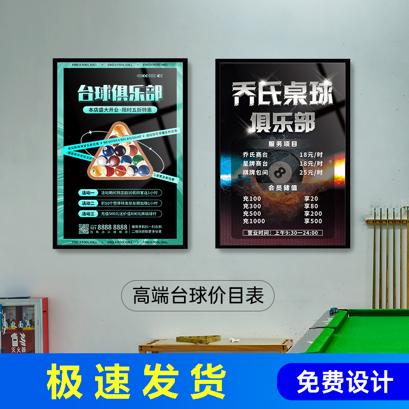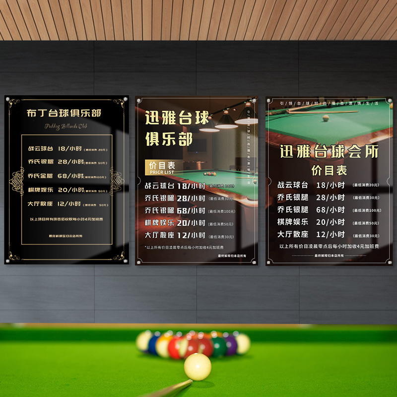亚克力台球室价目表定制桌球厅健身房洗浴咖啡酒店收费标准价位墙贴广告展示牌挂墙订制棋牌室价格表设计制作