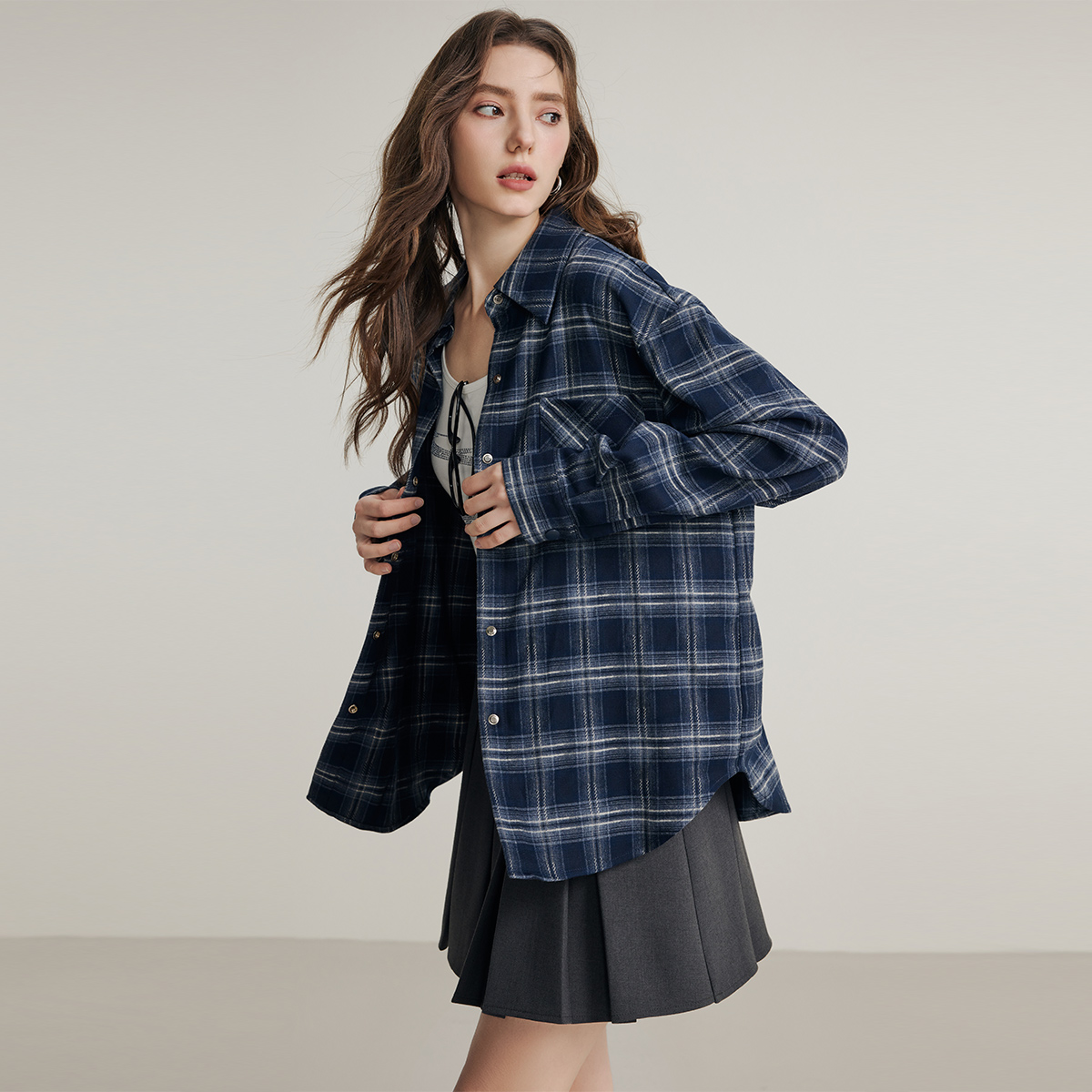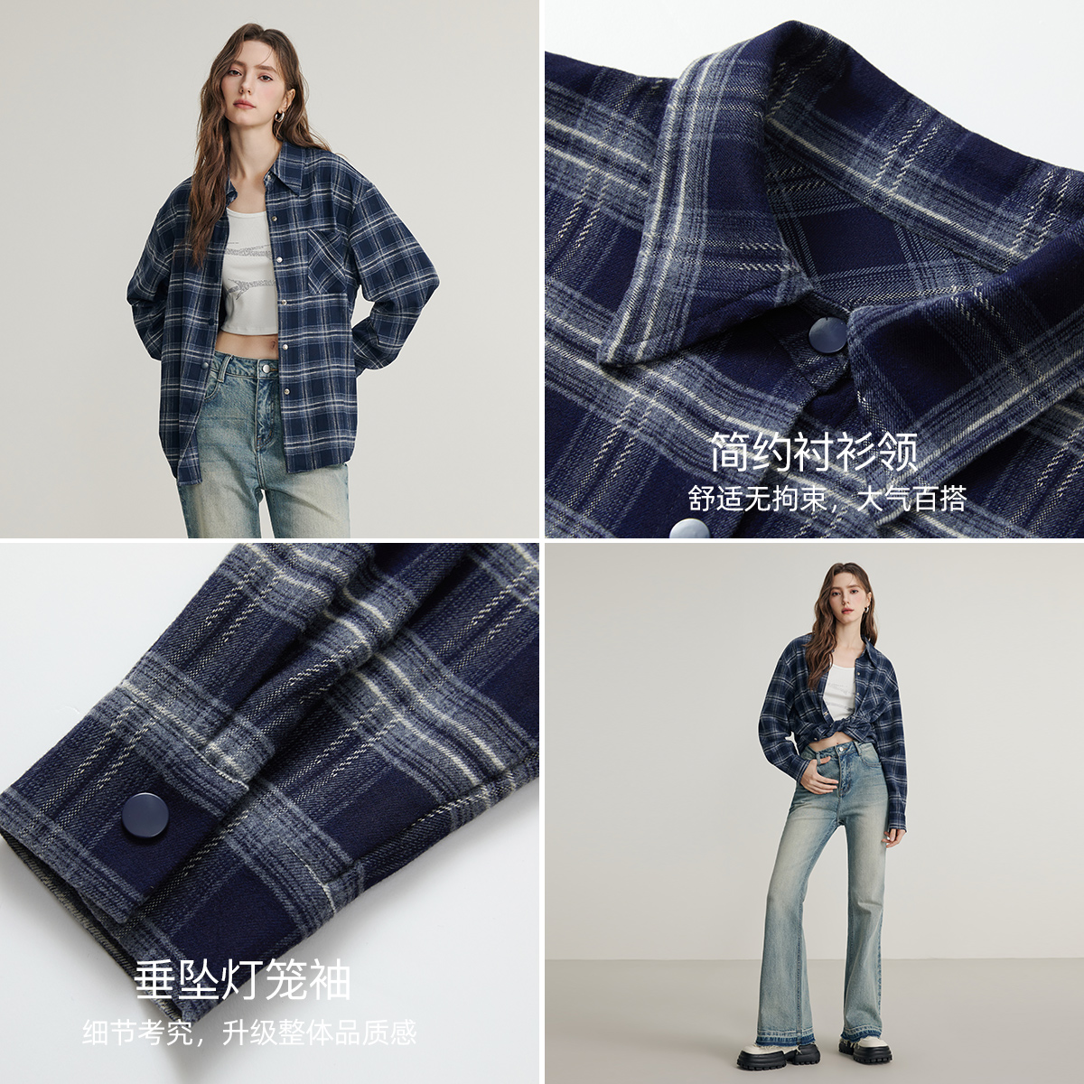 KBNE春秋新款 蓝色长袖 女装 衬衫 小个子磨毛格纹衬衣气质上衣 法式