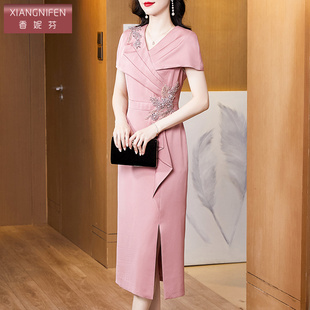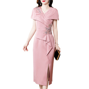 醋酸高端气质妈妈连衣裙 夏季 香妮芬手工钉珠喜婆婆婚宴装 2025新款