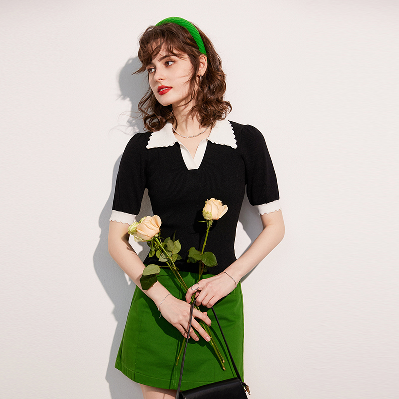 女式 花边翻领套头撞色修身 针织衫 时尚 上衣 夏款 白鹿语气质短袖