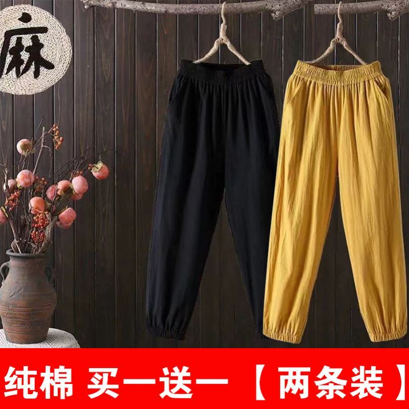 宽松大码 纯色灯笼裤 高腰束脚九分裤 夏季 女 单 休闲棉麻哈伦裤 两件