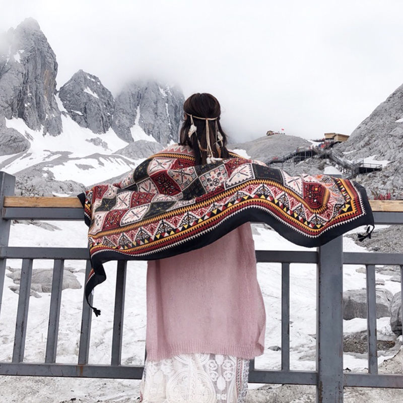 民族风围巾薄款 披肩女云南青海草原旅游穿搭丝巾海边纱巾防晒西北