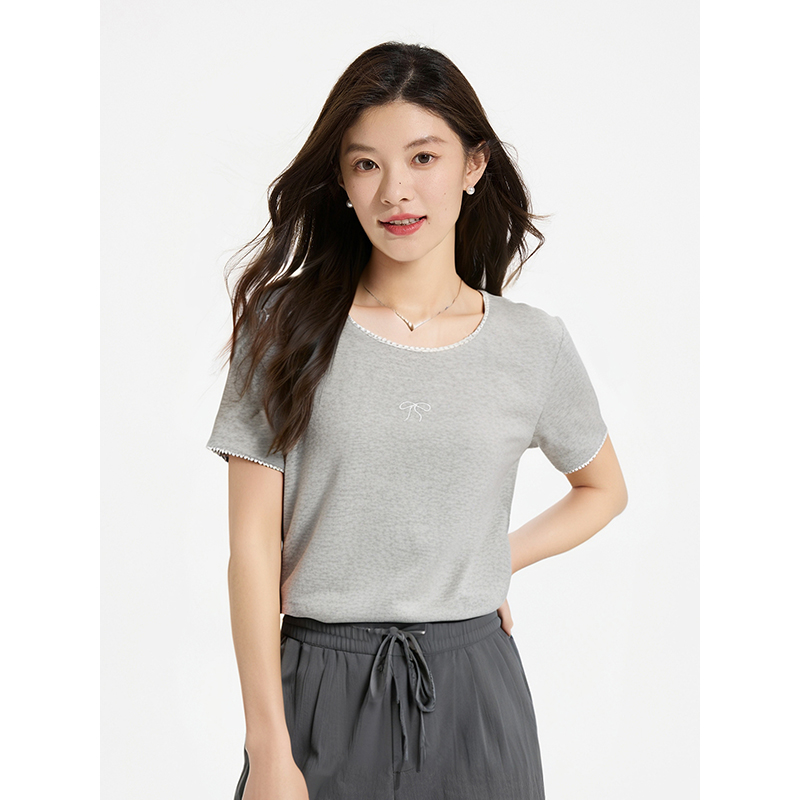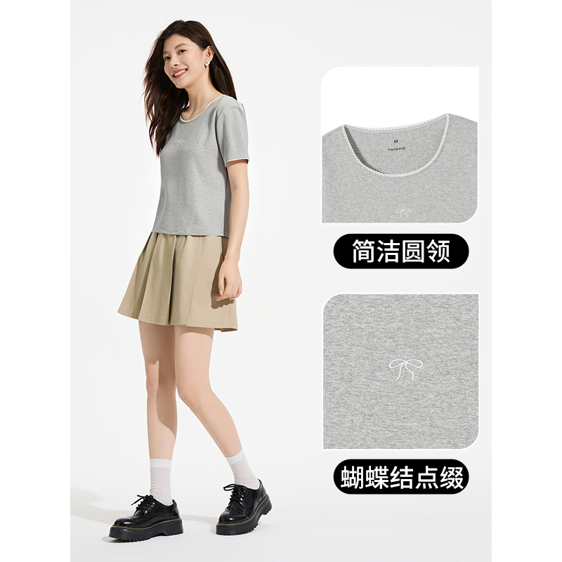 女士蝴蝶结花边短T小个子上衣 新款 热风灰色短袖 T恤上衣2025年夏季