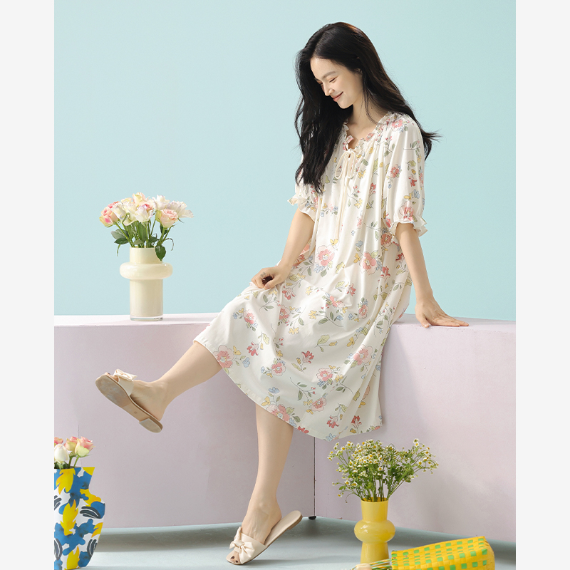 花卉睡衣裙甜美休闲大码 薄款 家居服中裙 纯棉中袖 芬腾女士睡裙夏季