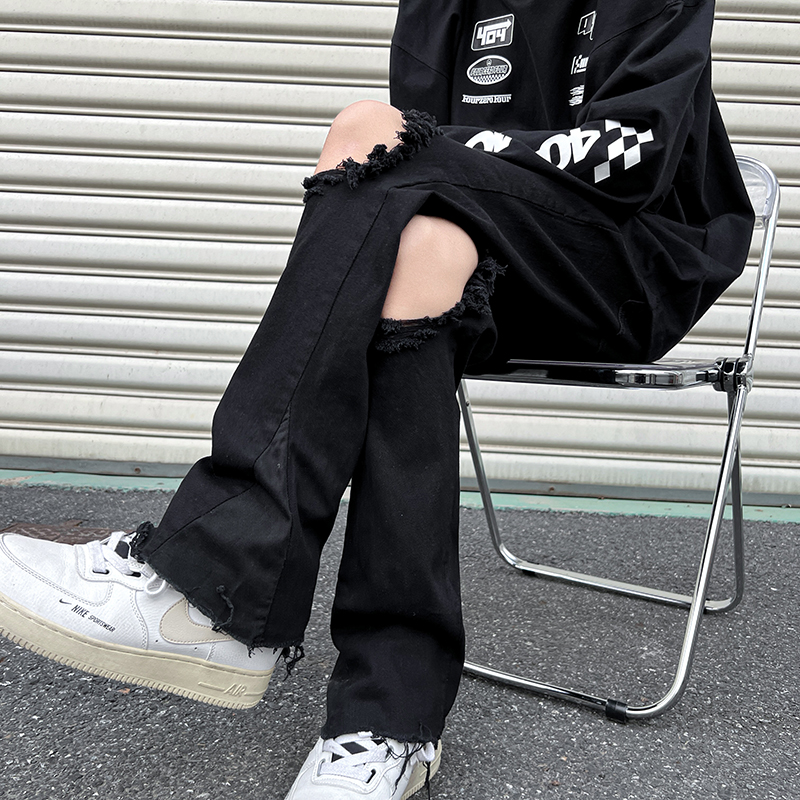直筒裤 破洞牛仔裤 痞帅高街vibe黑色修身 水洗做旧微喇叭裤 子 男秋季