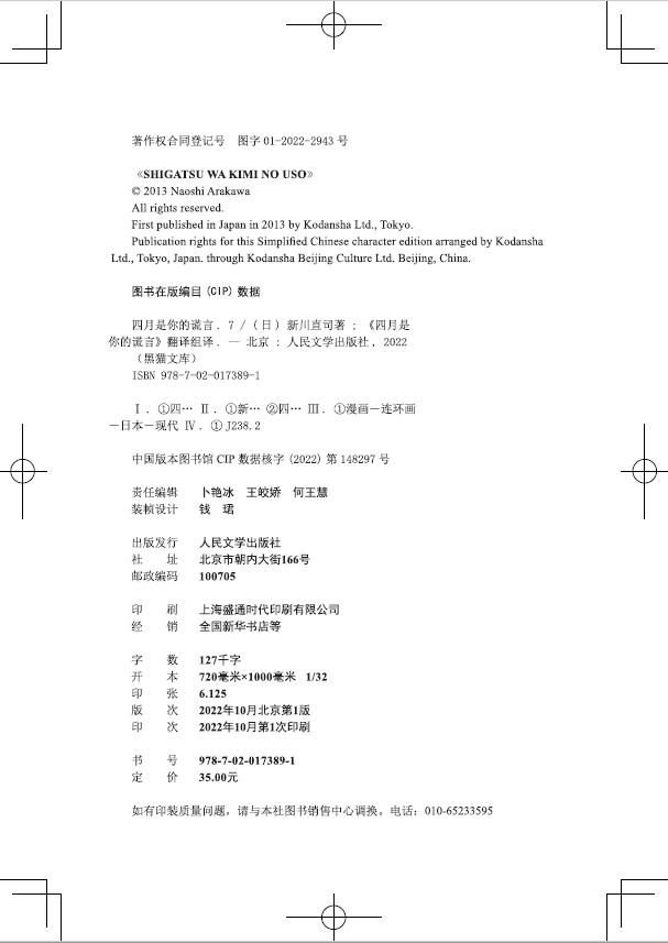 有马公生花江夏树 社 四月是你 人民文学出版 ANIPLEX讲谈社 宫园薰种田梨沙 豆瓣9.0原作漫画简体中文 新川直司 谎言7 包邮 正版