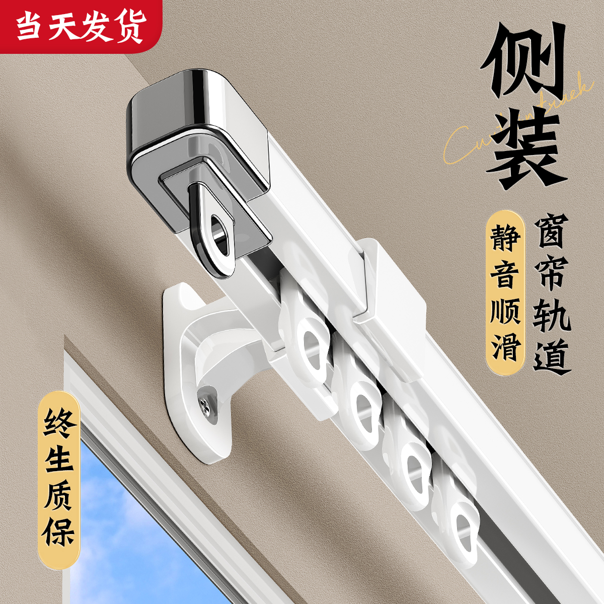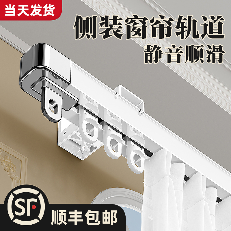 侧装 滑轨双轨滑道铝窗帘盒窗帘杆 窗帘轨道静音打孔单轨伸缩挂钩式
