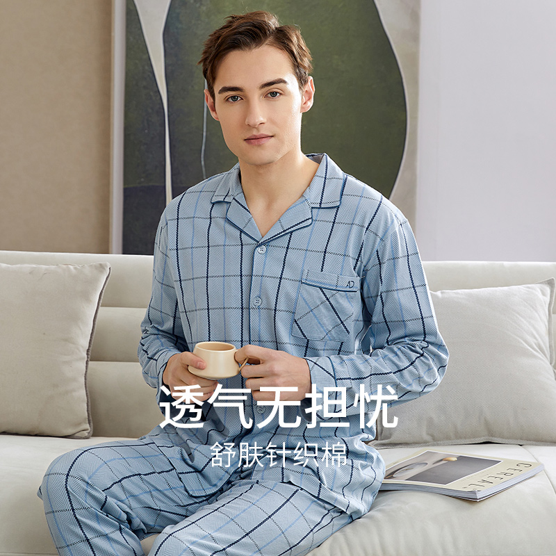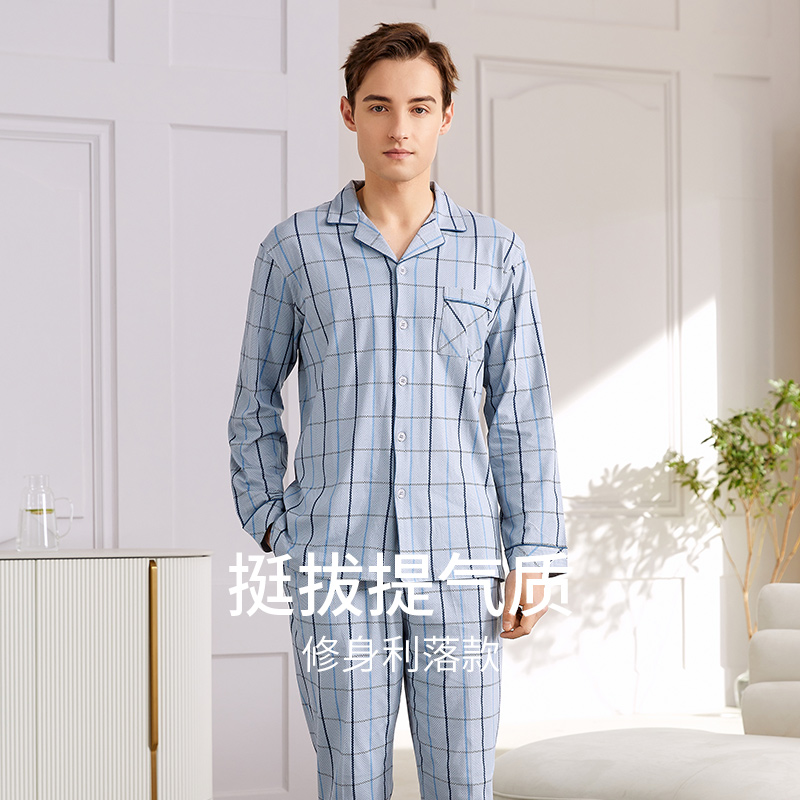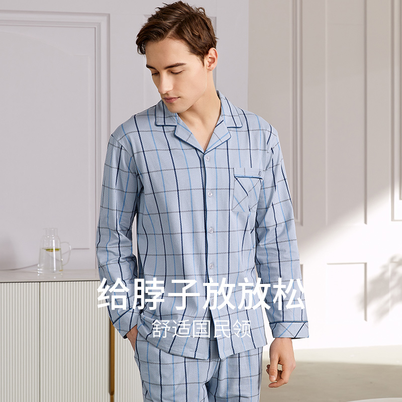 家居服睡眠柔软亲肤开衫 套装 格子睡衣男款 长袖 春秋款 秋鹿纯棉男士