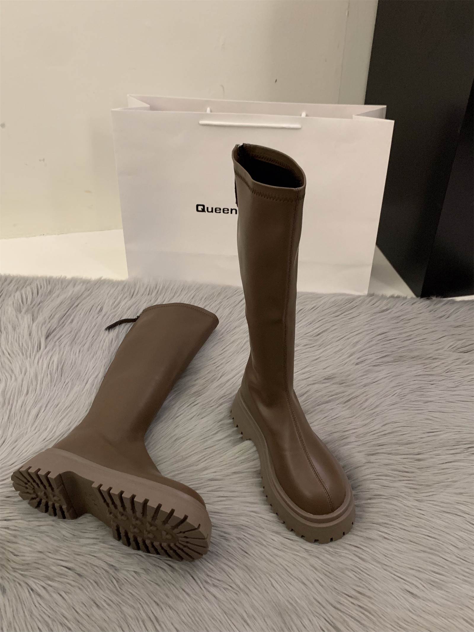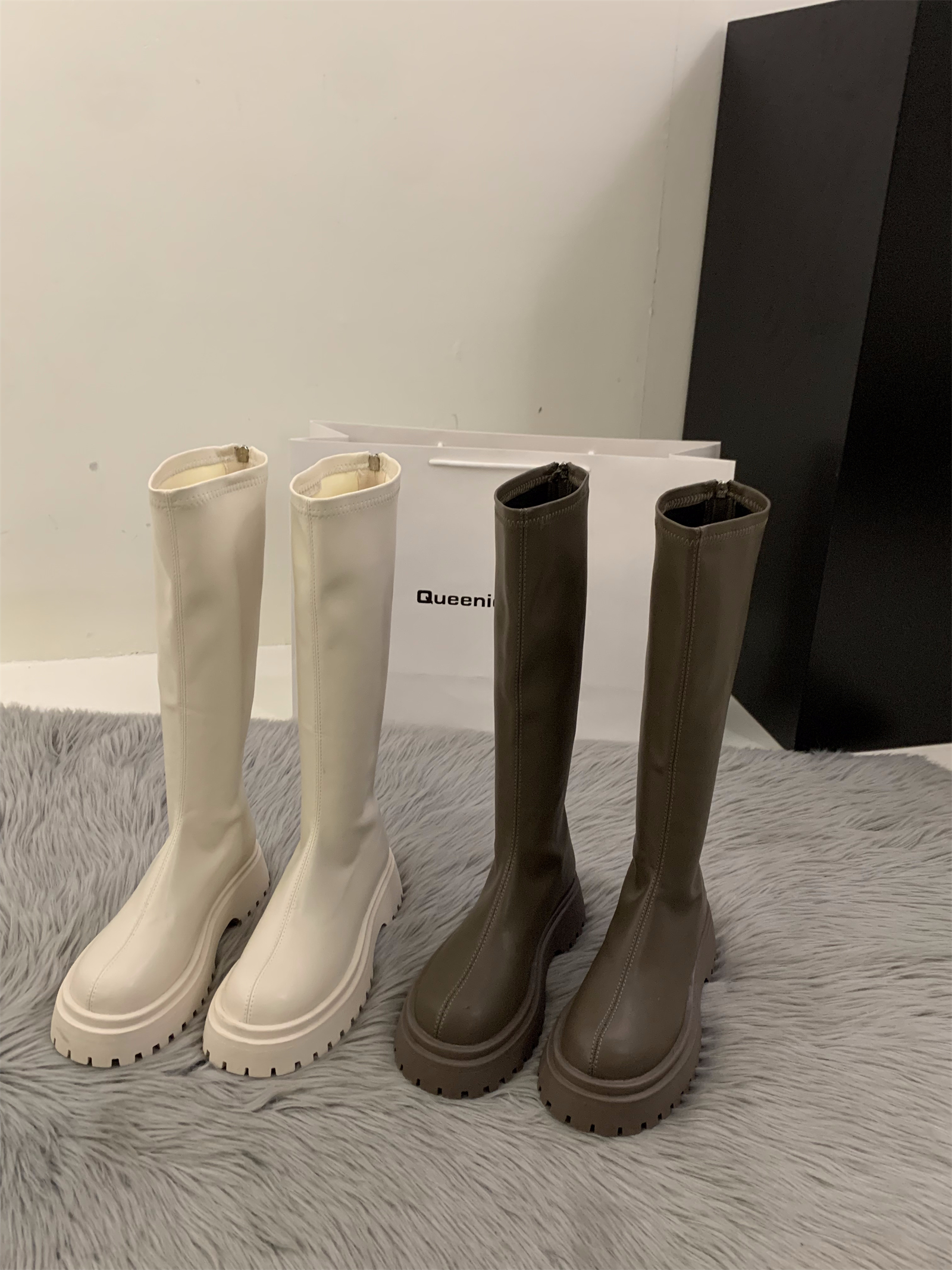 瘦瘦棕色长筒骑士靴子 秋冬季 厚底小个子白色中筒长靴女鞋 2025新款