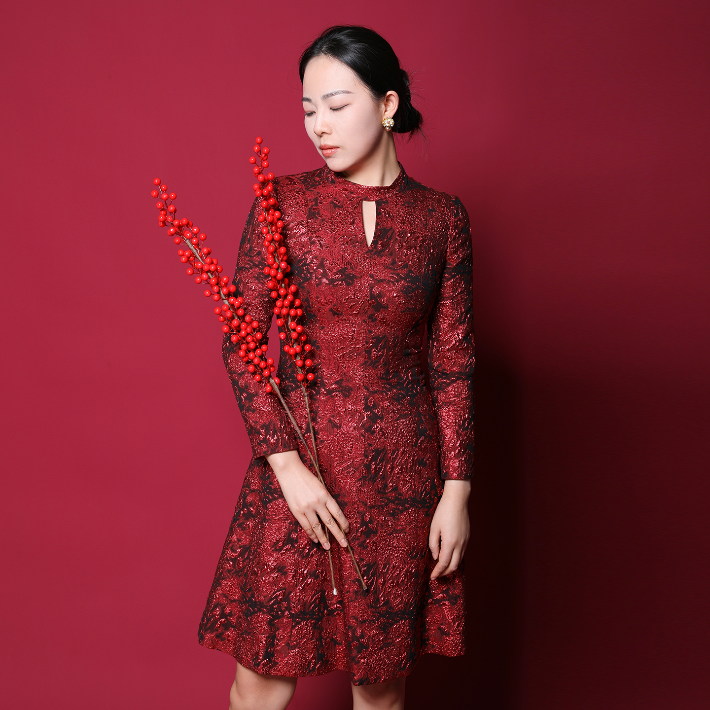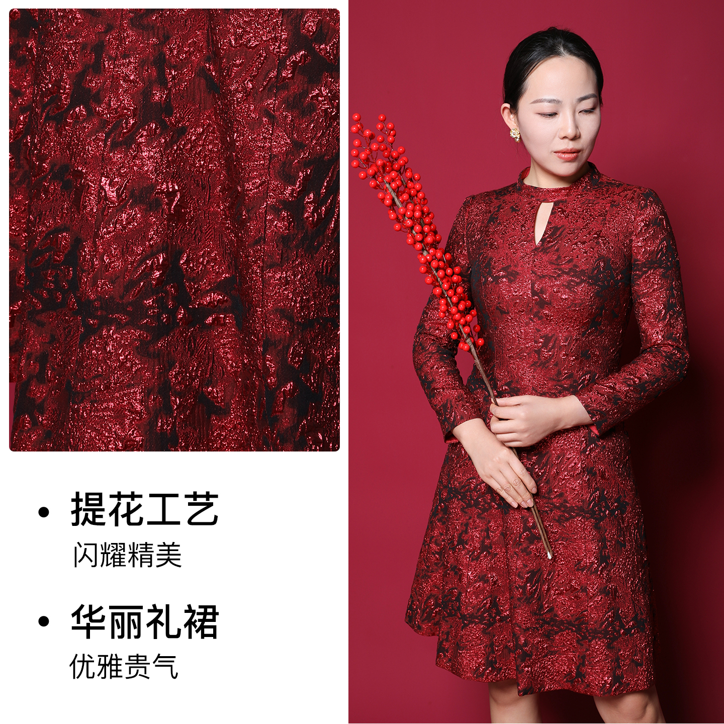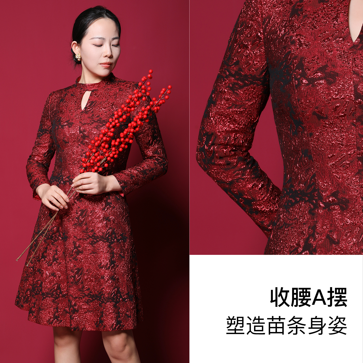 专柜正品 马天奴女红色金葱提花连衣裙气质裙子婚宴洋气礼裙夏时尚