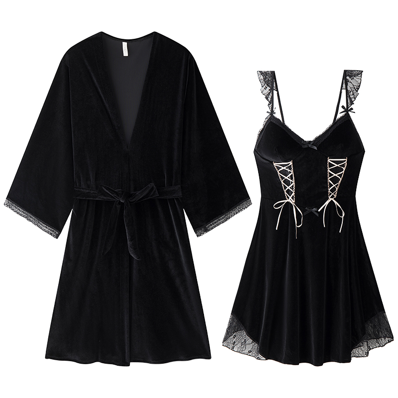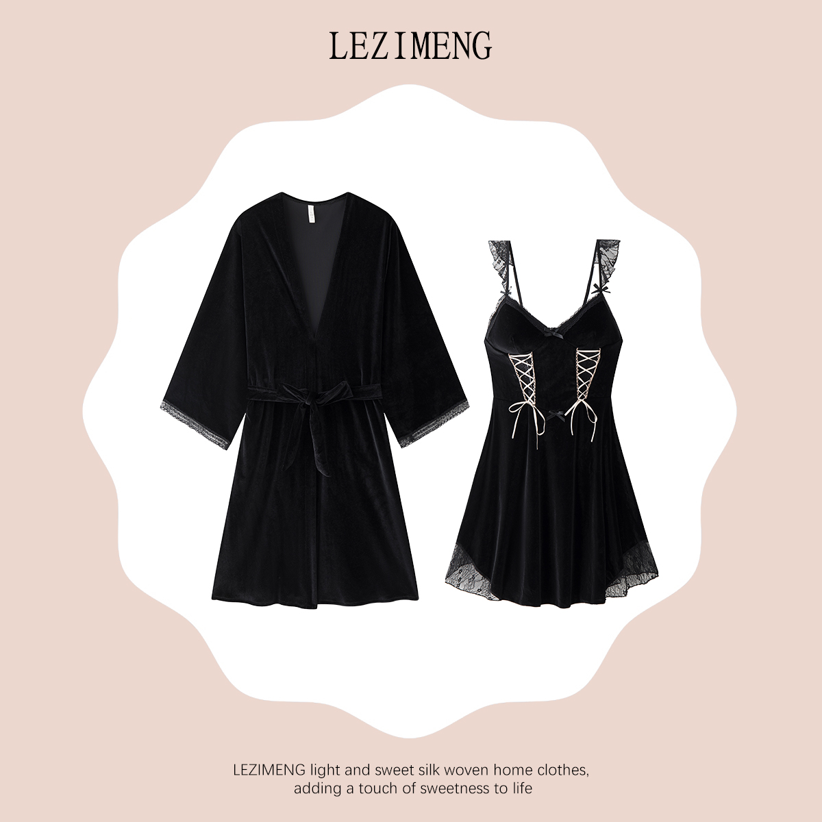 乐姿梦情侣睡衣女性感金丝绒吊带睡袍秋冬季 家居服 轻奢黑色男套装