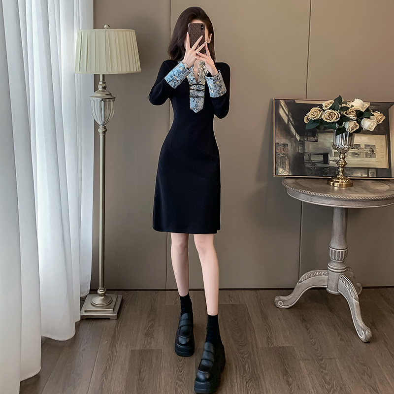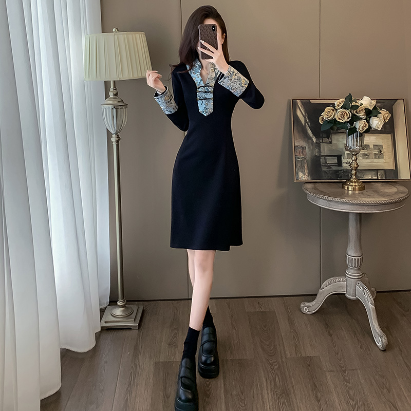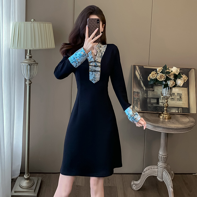 高级感超显瘦新中式 连衣裙女秋冬加绒加厚撞色拼接收腰显瘦旗袍裙