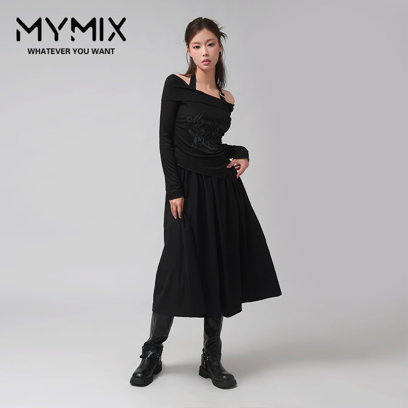 新款 拼贴吊带蕾丝连衣裙女25冬季 黑色不规则长裙 WANG白标 LEDIM