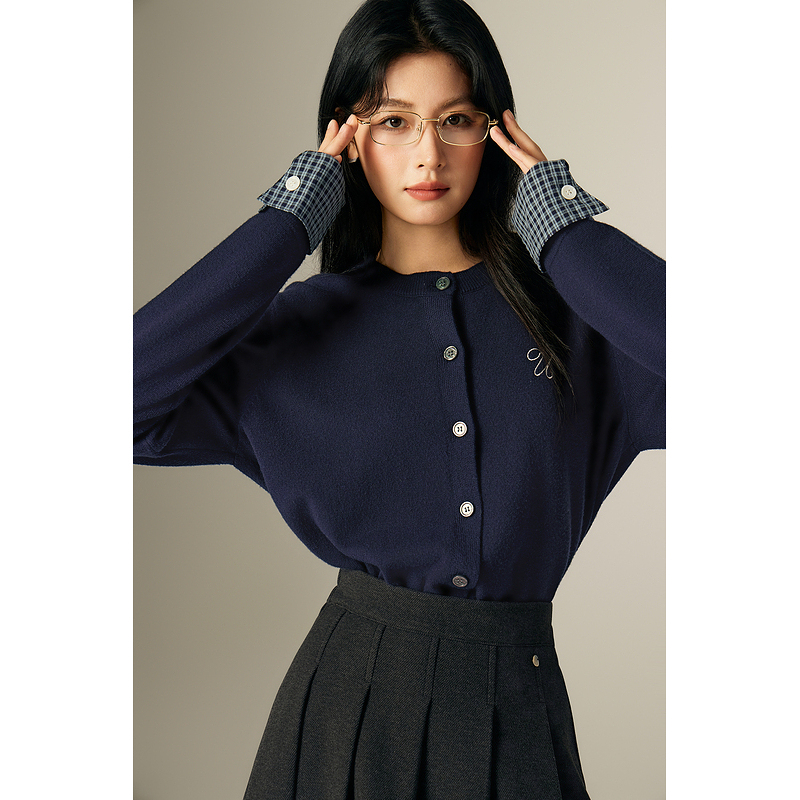 House 开衫 百家好2025秋冬翻边针织衫 圆领格子拼接短款 韩版 Basic